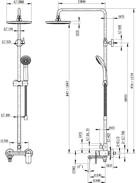 верхний душ, ручную лейку и смеситель, обеспечивающий их