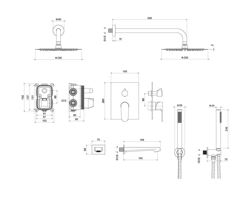 cмеситель для душа, верхний душ, душевой гарнитур, излив