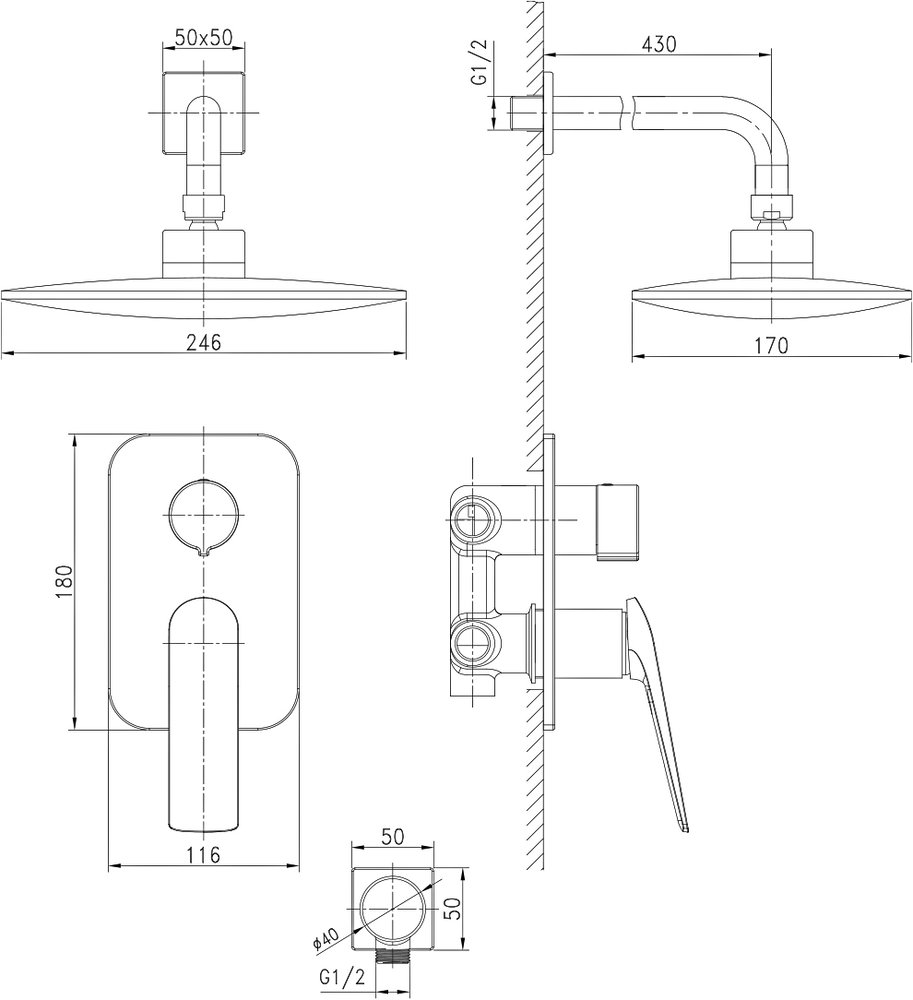 настенный держатель, смеситель, шланговое подключение, верхний душ, душевой гарнитур