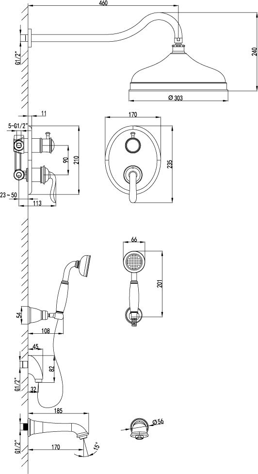 настенный держатель, смеситель, шланговое подключение, верхний душ, излив, душевой гарнитур