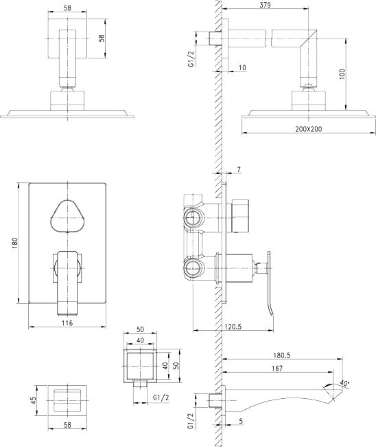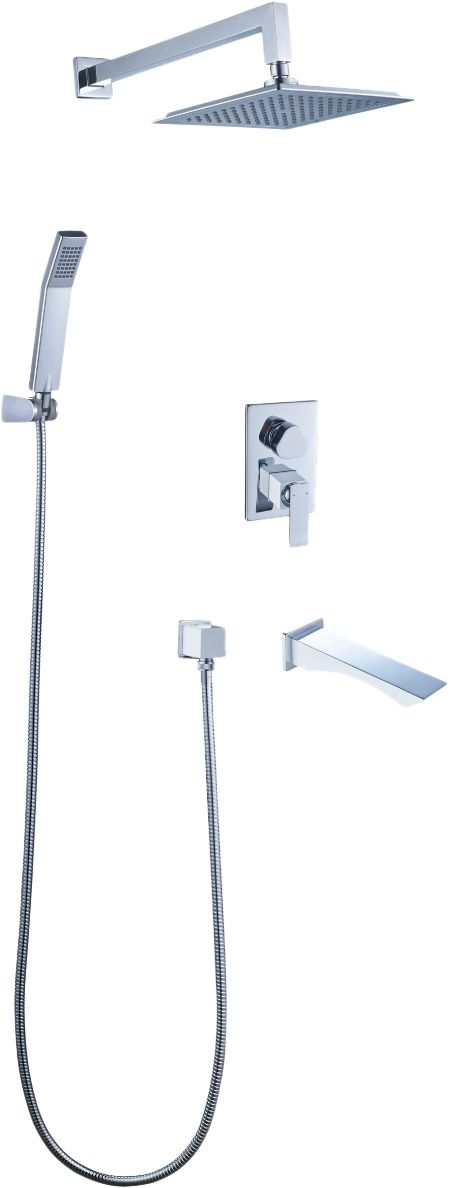 настенный держатель, смеситель, шланговое подключение, верхний душ, излив, душевой гарнитур