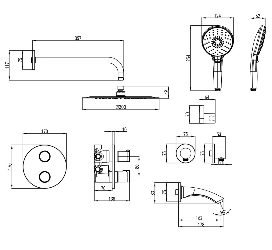 настенный держатель, смеситель, шланговое подключение, верхний душ, излив, душевой гарнитур