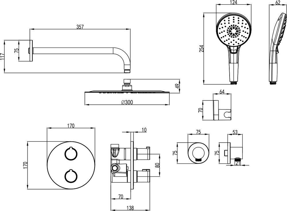 настенный держатель, смеситель, шланговое подключение, верхний душ, душевой гарнитур