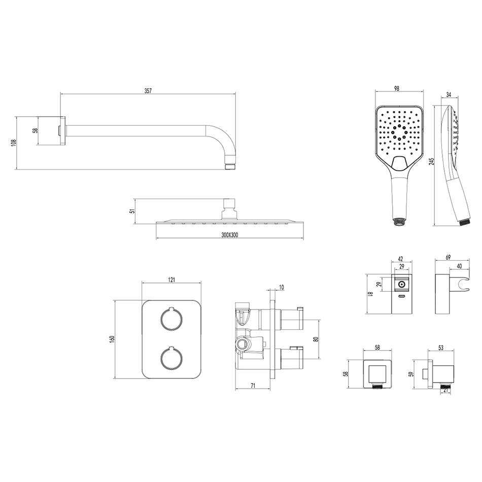 настенный держатель, смеситель, шланговое подключение, верхний душ, душевой гарнитур