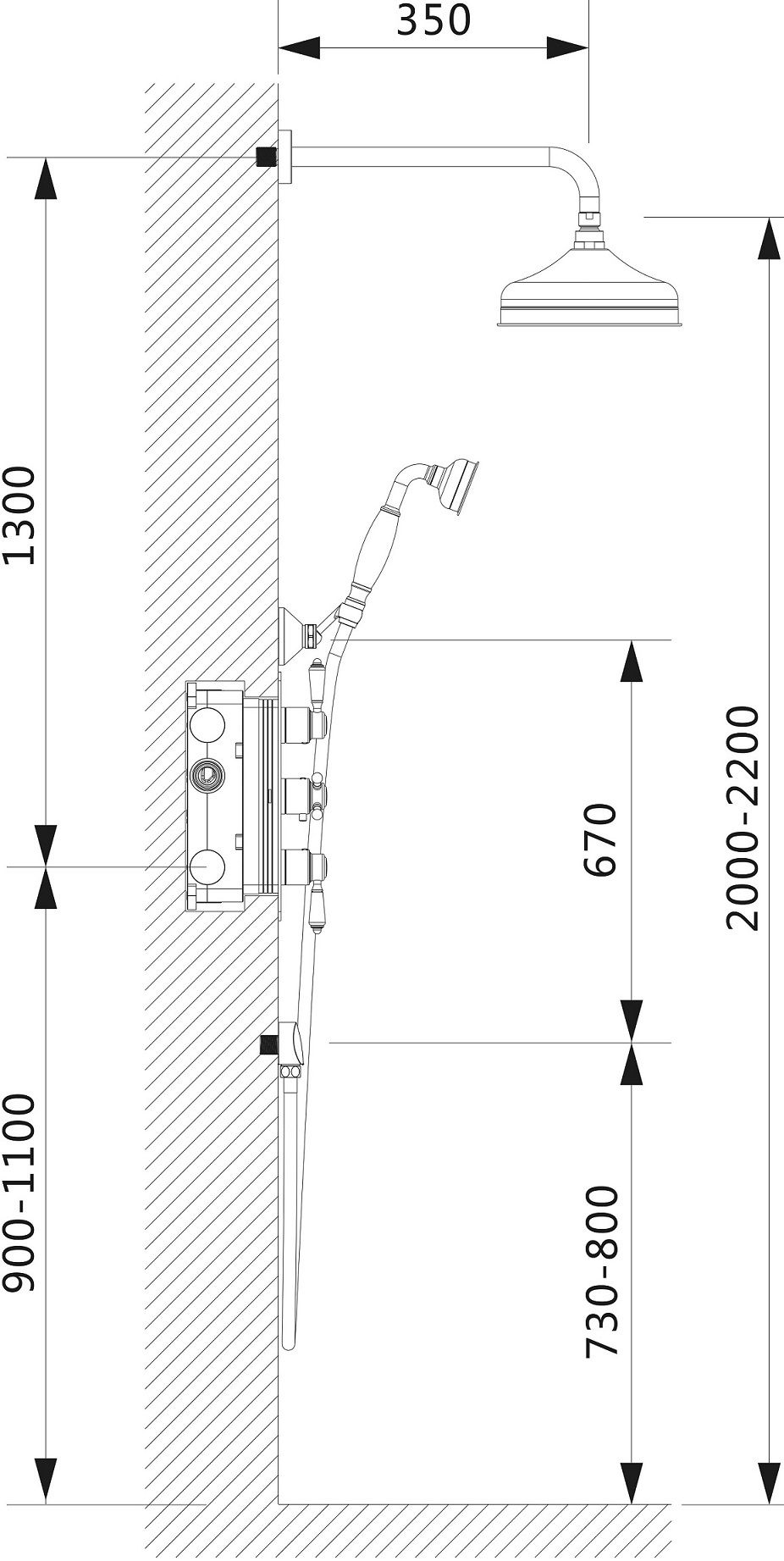 настенный держатель, смеситель, шланговое подключение, верхний душ, душевой гарнитур