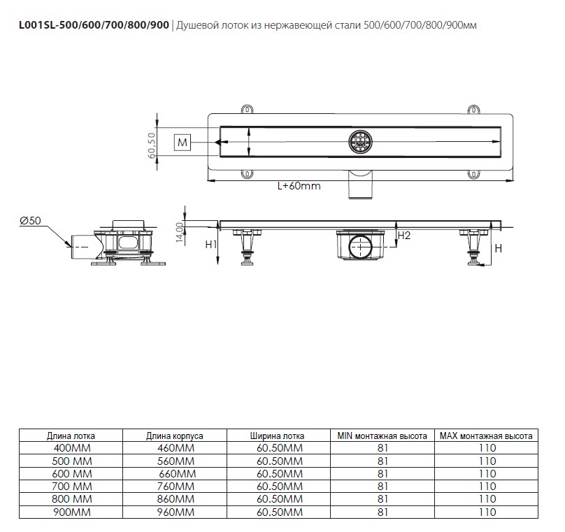 Душевой лоток Logan L001SL-900 с сухим затвором, щелевая/под плитку решетка из нержавеющей стали |