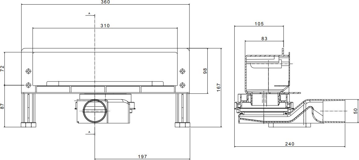 S-образный сифон поворачивается на 360°. Наружной частью лотка