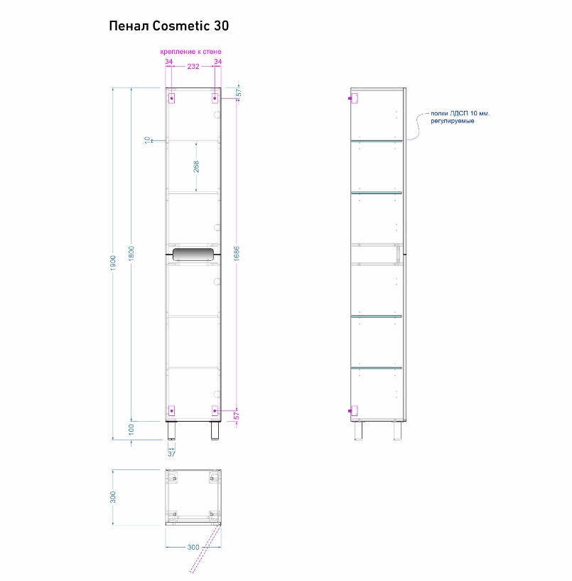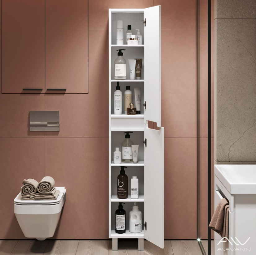 Шкаф-пенал Cosmetic 30 в белом исполнении – идеальное решение для организации хранения в ванной комнате. Два распашных фасада из МДФ с глянцевым покрытием ПВХ снабжены доводчиками для плавного закрывания. Внутри 4 переставляемые полки, удобные для хранения полотенец, косметики и бытовой химии.