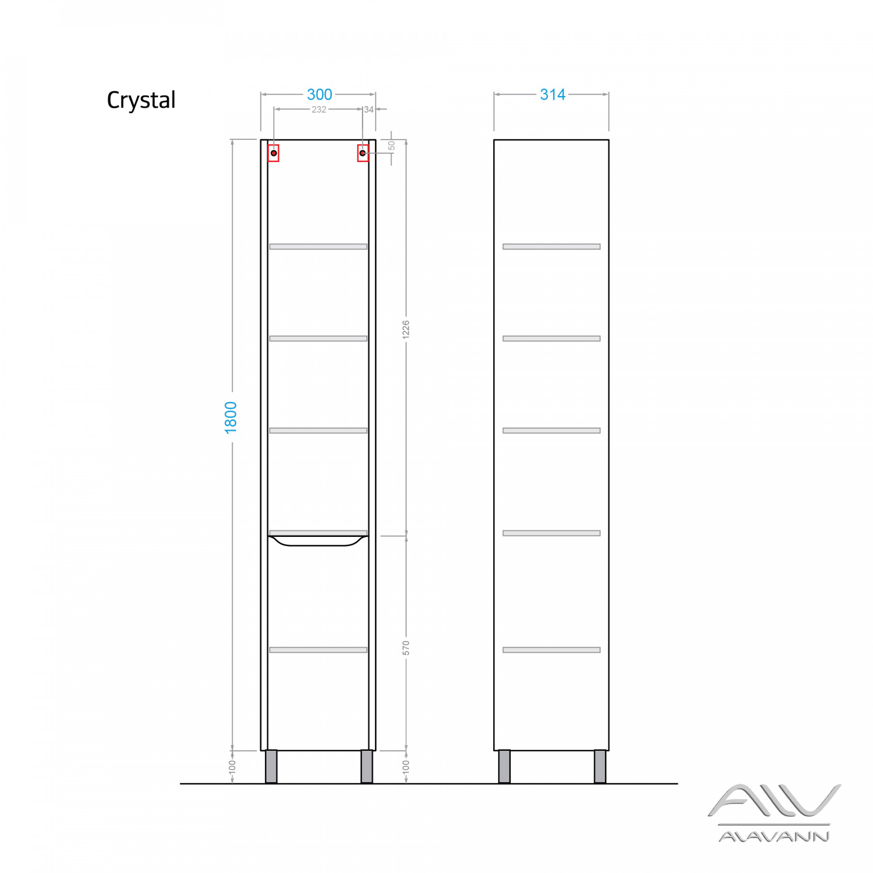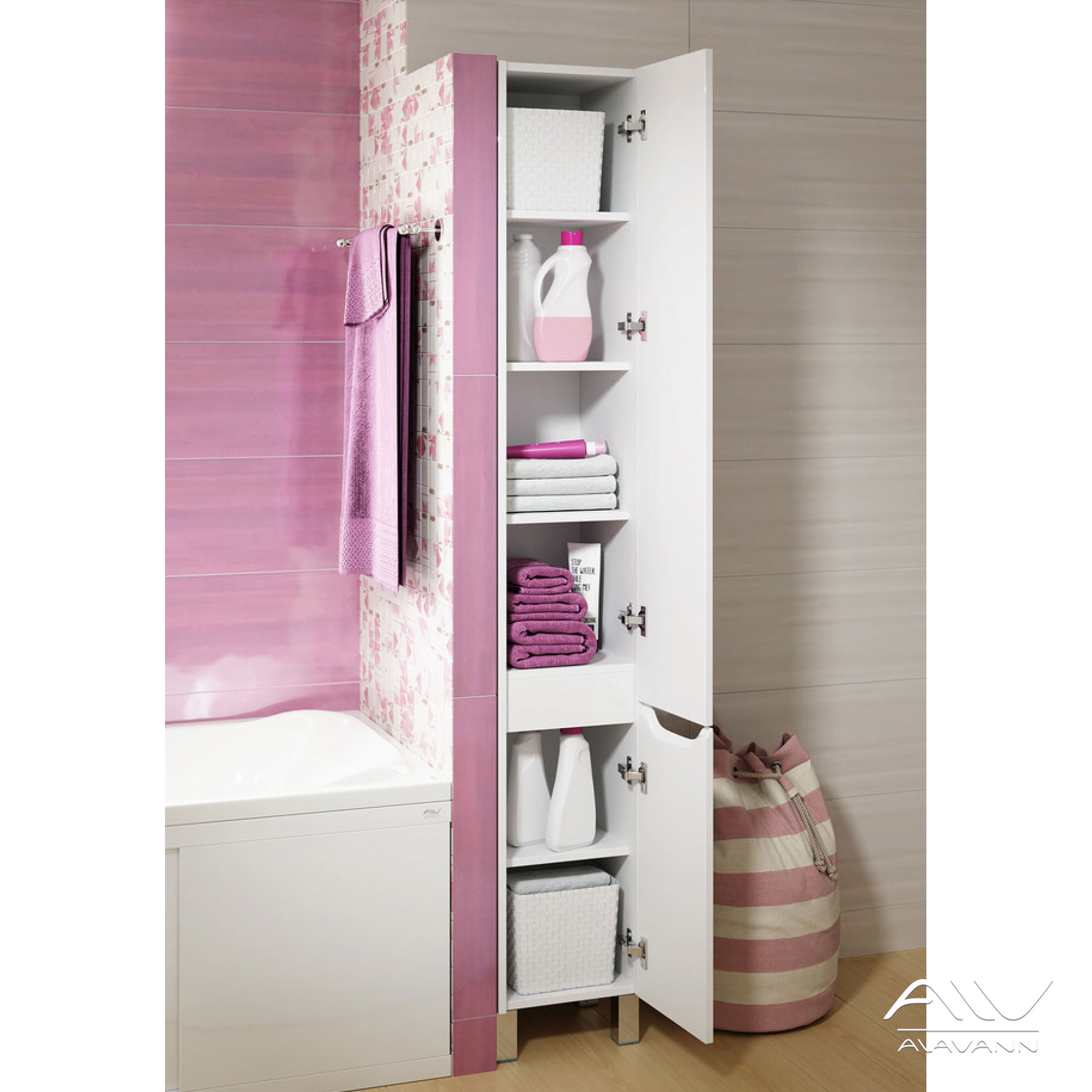 Шкаф - пенал Crystal 30 - стильное и лаконичное дополнение базовой коллекции Crystal. За двумя распашными фасадами расположены съемные полки для полотенец, халатов и флаконов с моющими средствами.