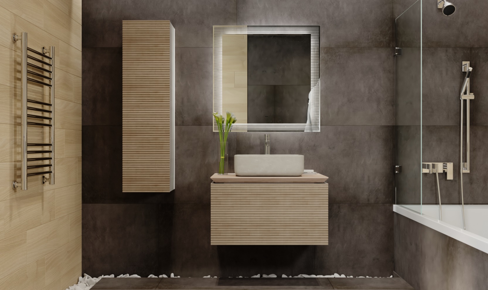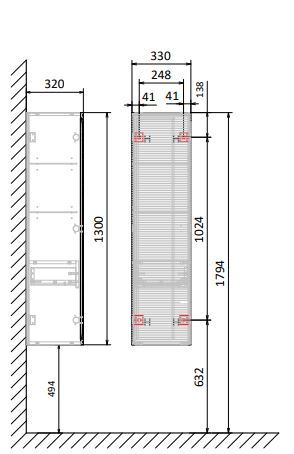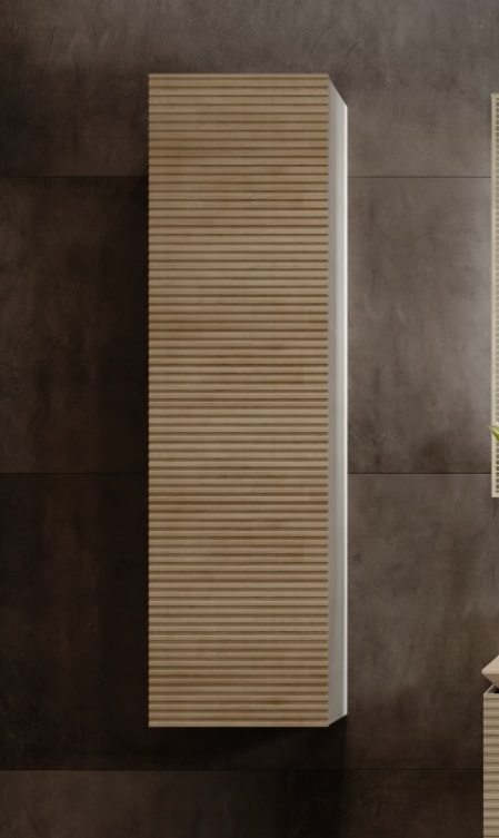 Подвесной пенал выполнен из МДФ в пленке ПВХ цвета сваетлый бук. С одной дверкой вертикального открывания и стеклянными и деревянными полками внутри.