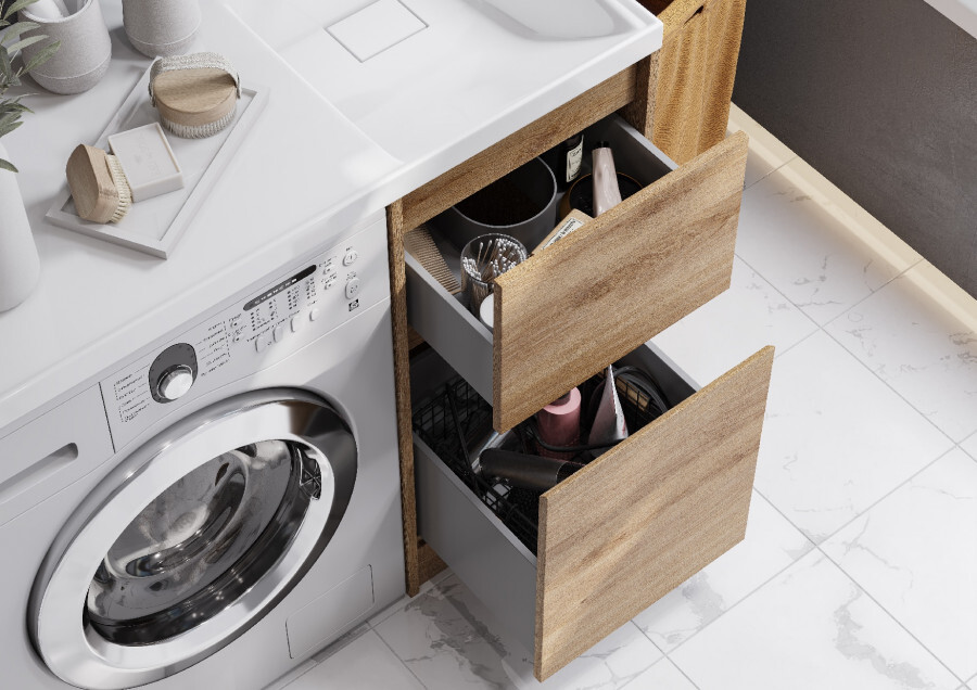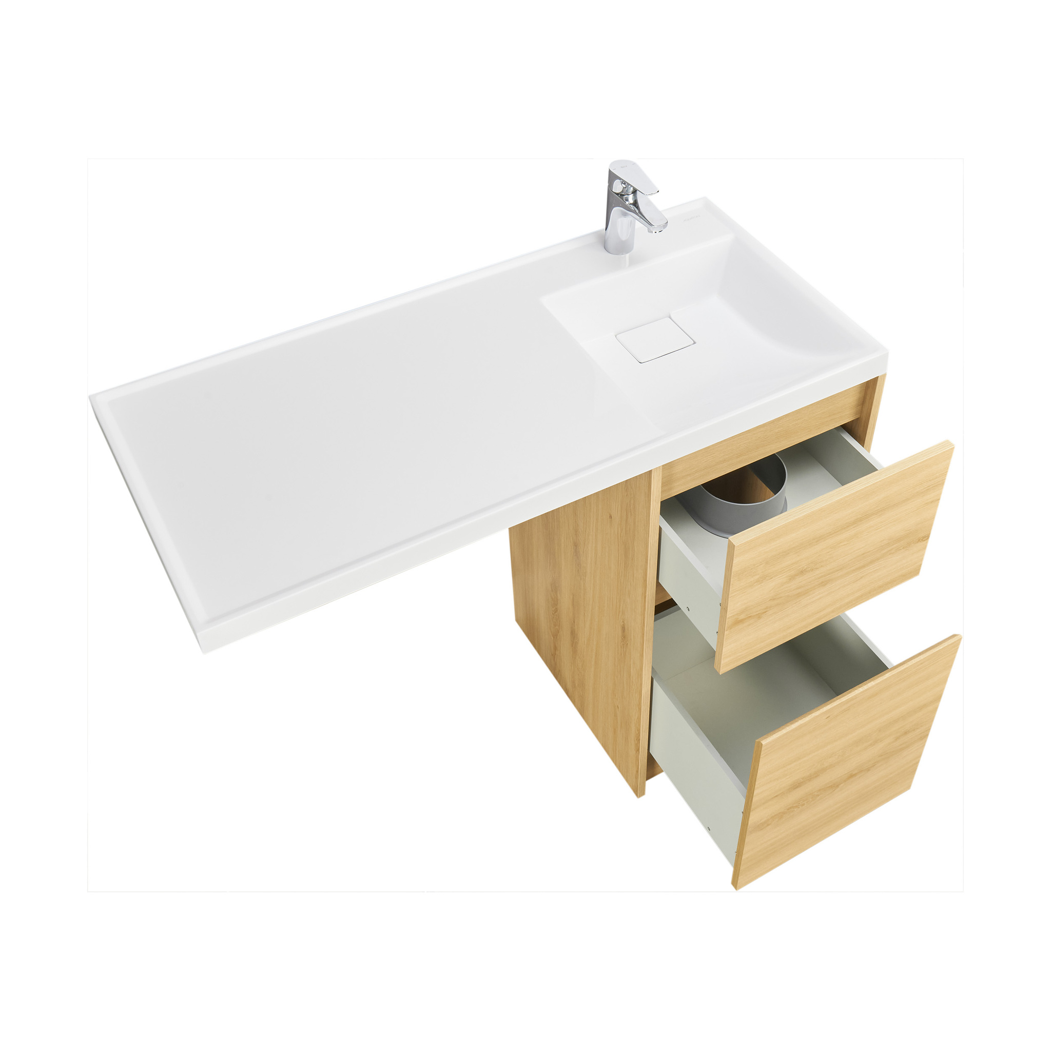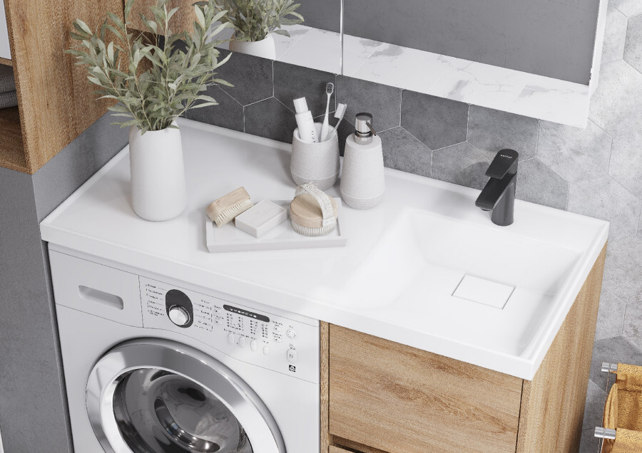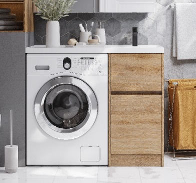 Тумба Лондри под стиральную машину выполнена из влагостойкой ламинированной плиты в древесной отделке. Верхний ящик открывается с помощью системы push-to-open, а нижний - за фасад с помощью удобного выпила под углом. Ящики выдерживают нагрузку до 25 кг. Тумба установлена на регулируемые опоры, которые находятся за цоколем. Тумба комплектуется раковиной Лондри 105 из прочного литого мрамора, который устойчив к воздействию химических средств. Широкое крыло раковины обеспечивает ванную комнату дополнительным функциональным пространством. Раковина приобретается отдельно. Дополнительно к тумбе можно приобрести шкаф-колонну Лондри и зеркальный шкаф Лондри 100.