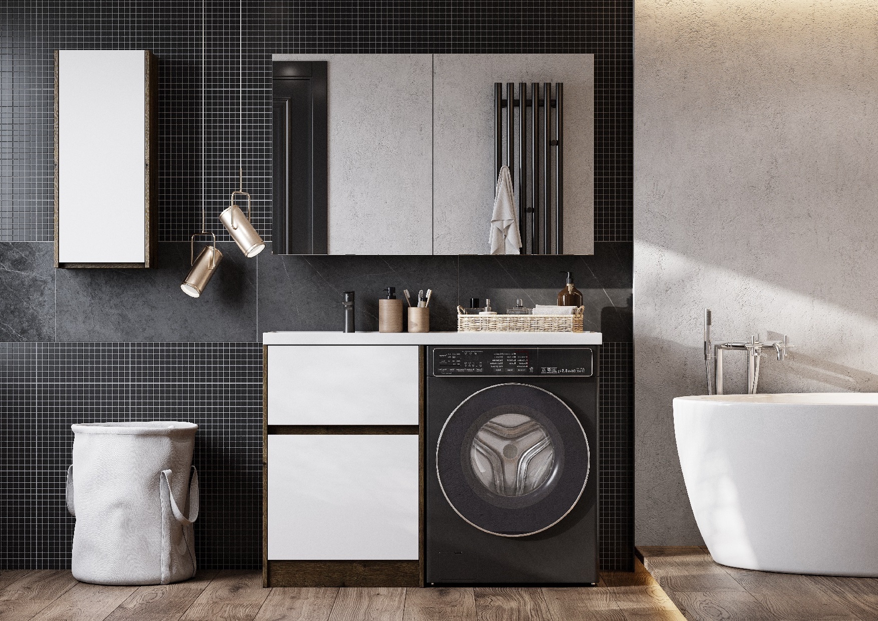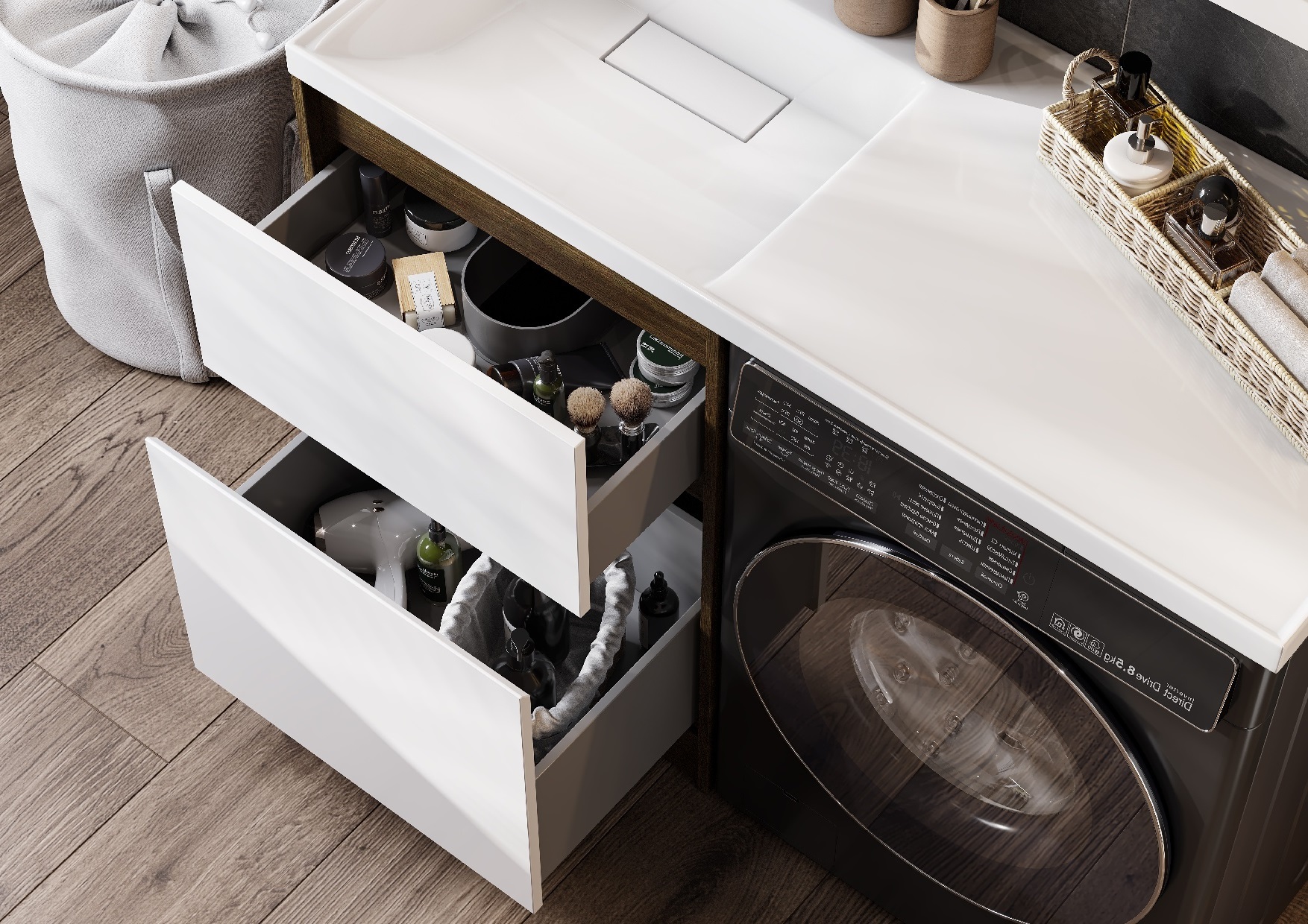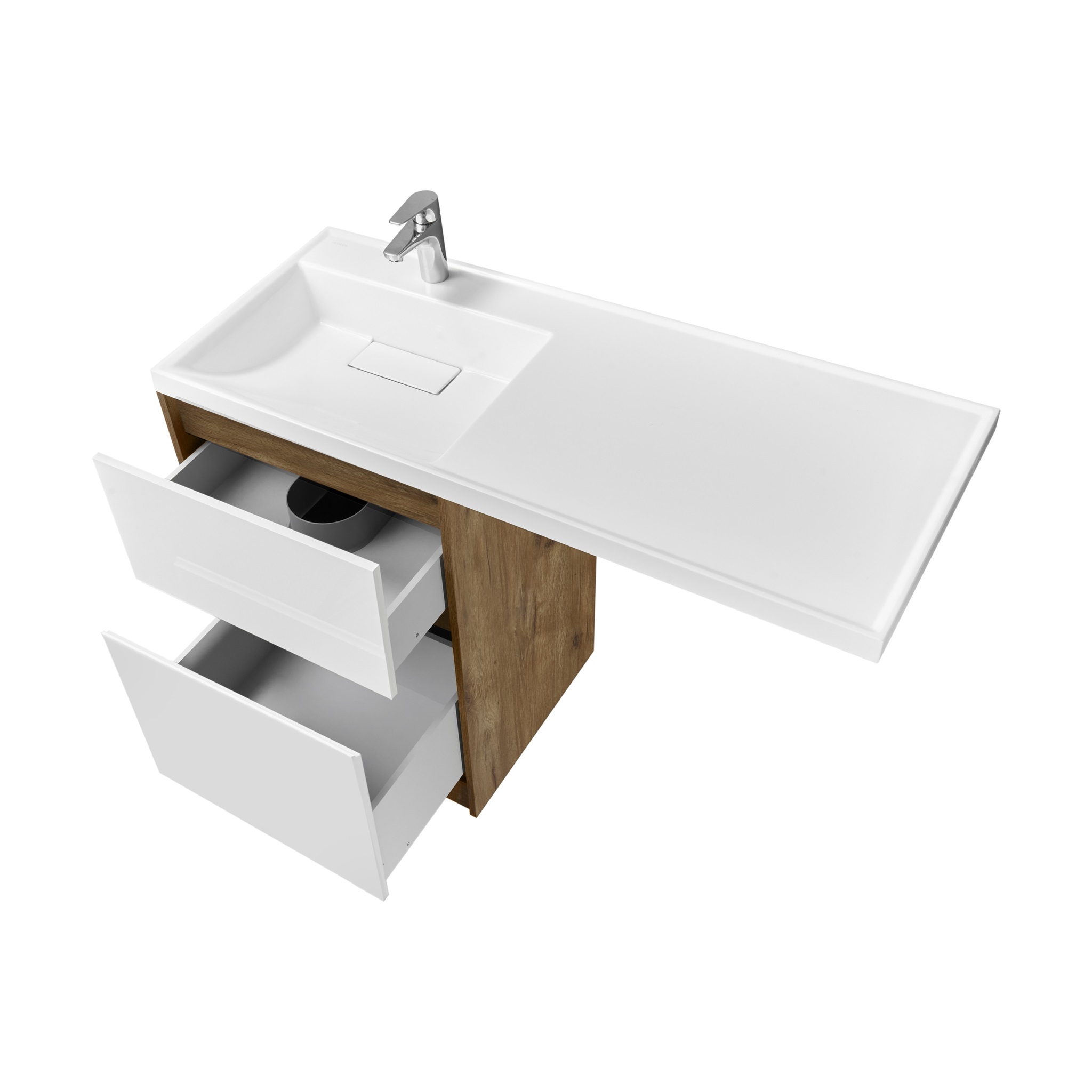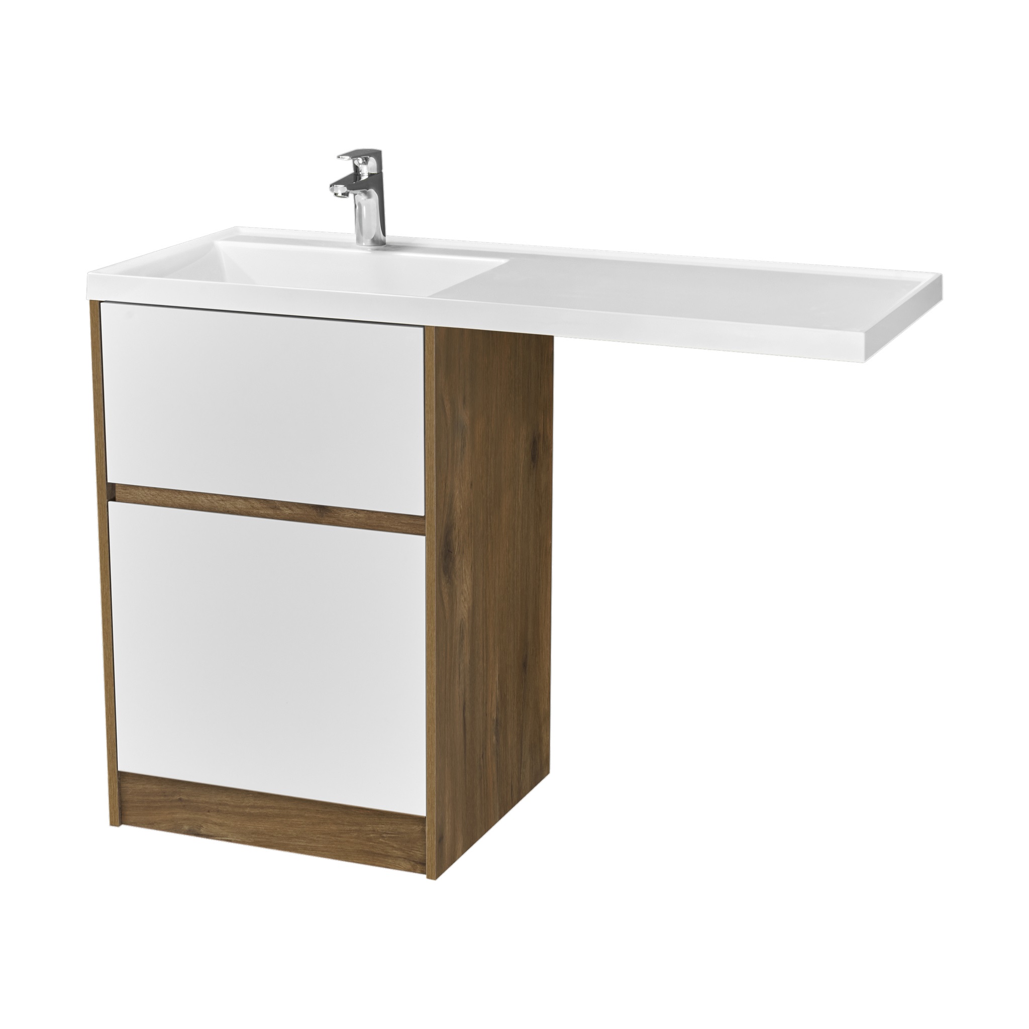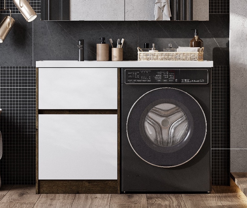 Тумба Лондри под стиральную машину выполнена из влагостойкой ламинированной плиты в древесной отделке. Верхний ящик открывается с помощью системы push-to-open, а нижний - за фасад с помощью удобного выпила под углом. Ящики выдерживают нагрузку до 25 кг. Тумба установлена на регулируемые опоры, которые находятся за цоколем. Тумба комплектуется раковиной Лондри 120 из прочного литого мрамора, который устойчив к воздействию химических средств. Широкое крыло раковины обеспечивает ванную комнату дополнительным функциональным пространством. Раковина приобретается отдельно. Дополнительно к тумбе можно приобрести шкаф-колонну Лондри и зеркальный шкаф Лондри 120.