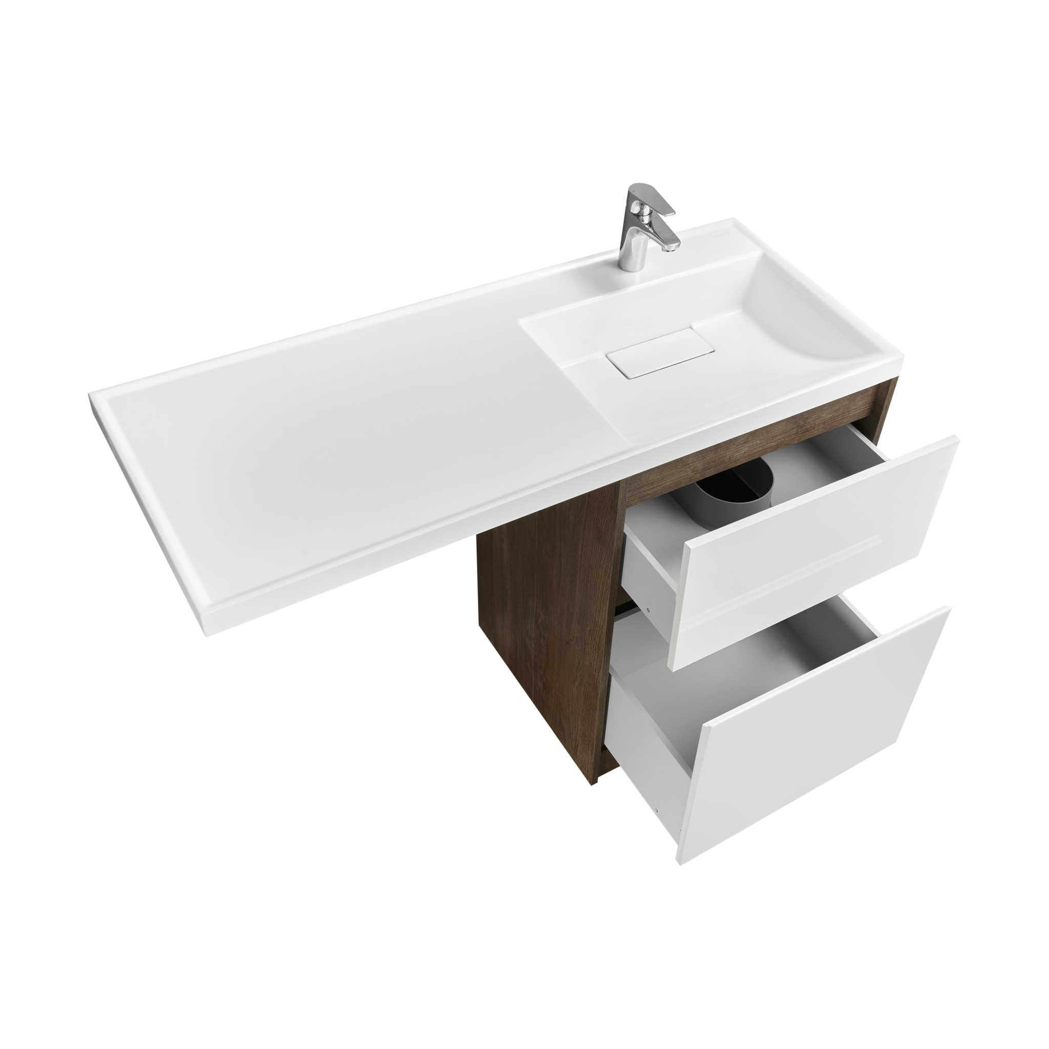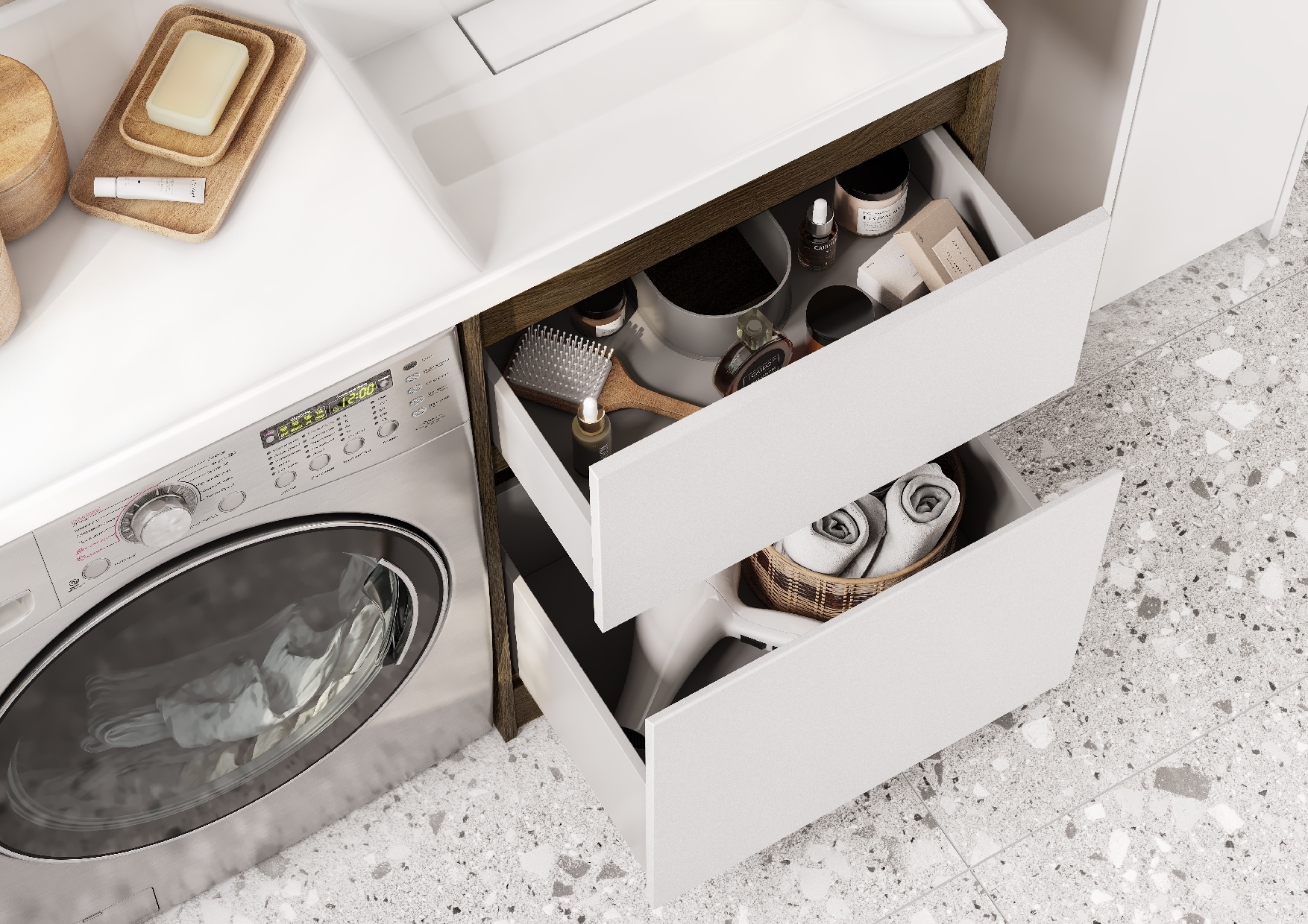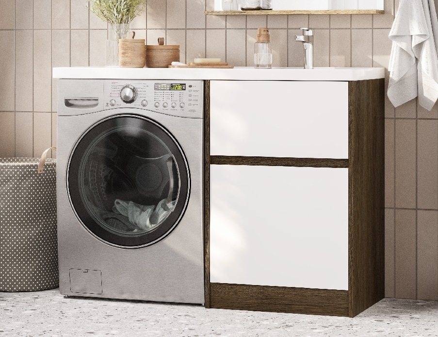 Тумба Лондри под стиральную машину выполнена из влагостойкой ламинированной плиты в древесной отделке. Верхний ящик открывается с помощью системы push-to-open, а нижний - за фасад с помощью удобного выпила под углом. Ящики выдерживают нагрузку до 25 кг. Тумба установлена на регулируемые опоры, которые находятся за цоколем. Тумба комплектуется раковиной Лондри 120 из прочного литого мрамора, который устойчив к воздействию химических средств. Широкое крыло раковины обеспечивает ванную комнату дополнительным функциональным пространством. Раковина приобретается отдельно. Дополнительно к тумбе можно приобрести шкаф-колонну Лондри и зеркальный шкаф Лондри 120.