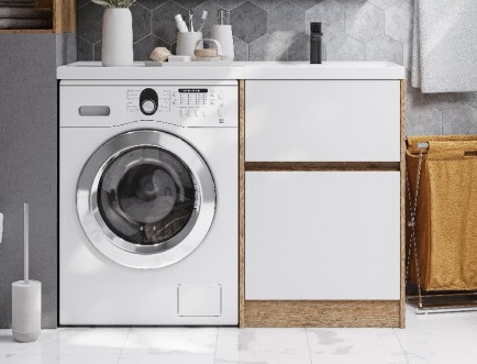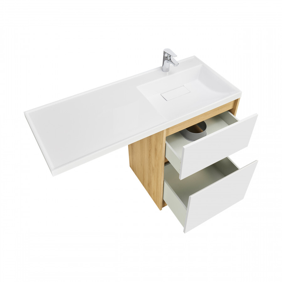 Тумба Лондри под стиральную машину выполнена из влагостойкой ламинированной плиты в древесной отделке. Верхний ящик открывается с помощью системы push-to-open, а нижний - за фасад с помощью удобного выпила под углом. Ящики выдерживают нагрузку до 25 кг. Тумба установлена на регулируемые опоры, которые находятся за цоколем. Тумба комплектуется раковиной Лондри 120 из прочного литого мрамора, который устойчив к воздействию химических средств. Широкое крыло раковины обеспечивает ванную комнату дополнительным функциональным пространством. Раковина приобретается отдельно. Дополнительно к тумбе можно приобрести шкаф-колонну Лондри и зеркальный шкаф Лондри 120.