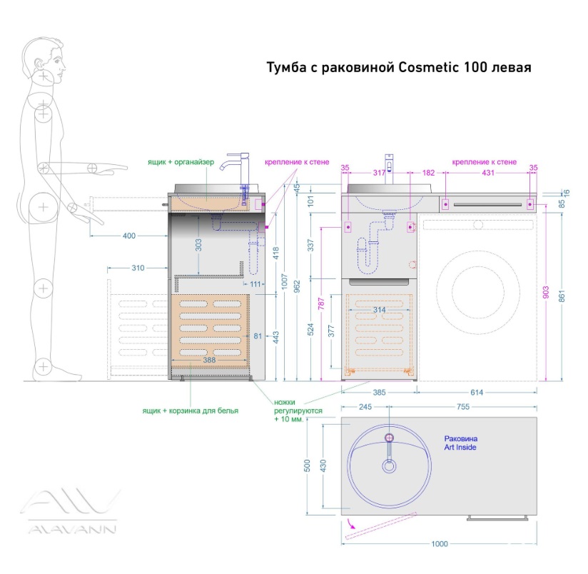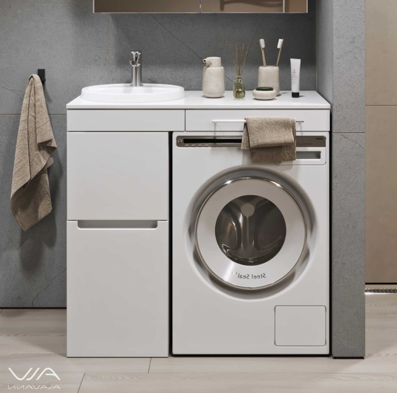 Тумба с раковиной Alavann Cosmetic 100 L под стиральную машину, напольная, глянцевая белая