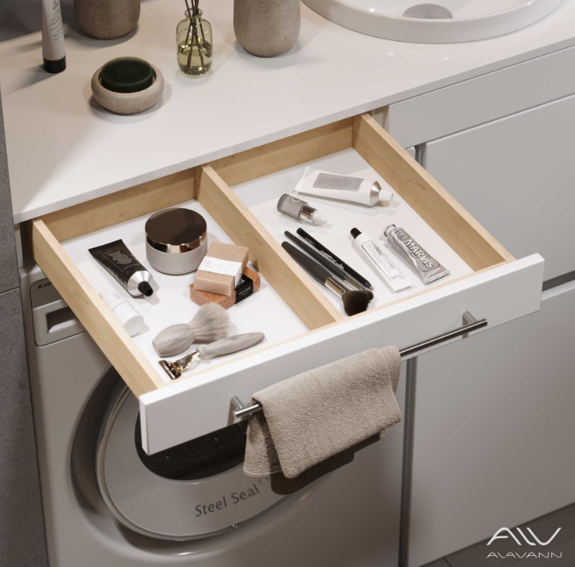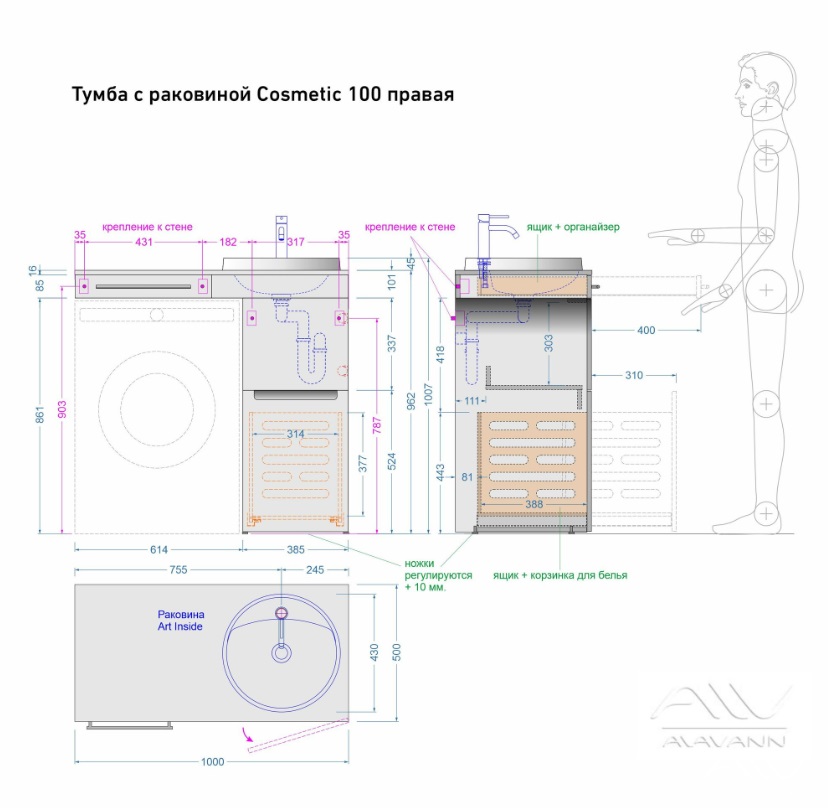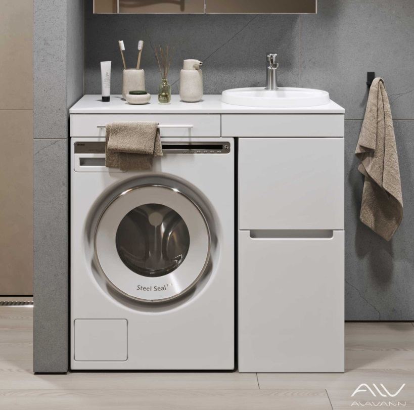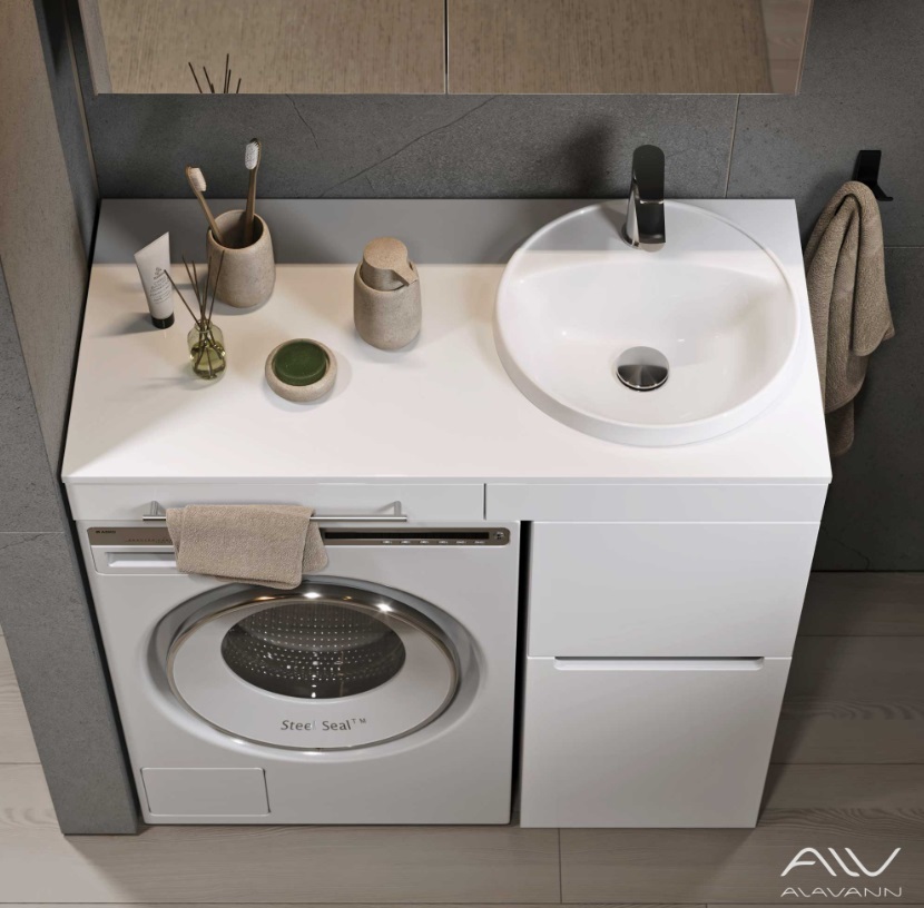 Тумба с раковиной Alavann Cosmetic 100 R под стиральную машину, напольная, глянцевая белая