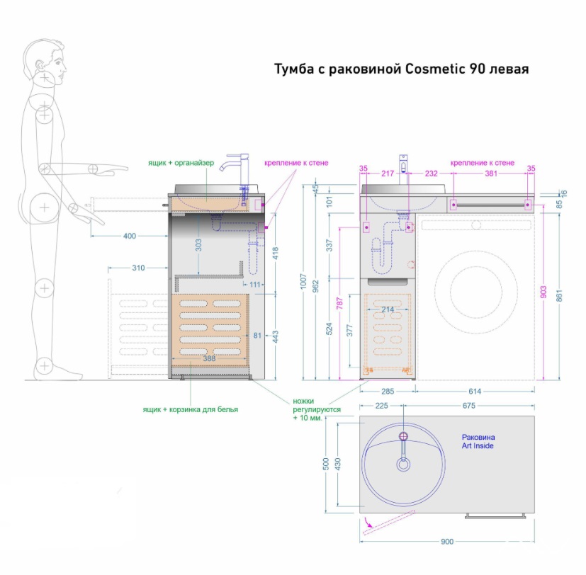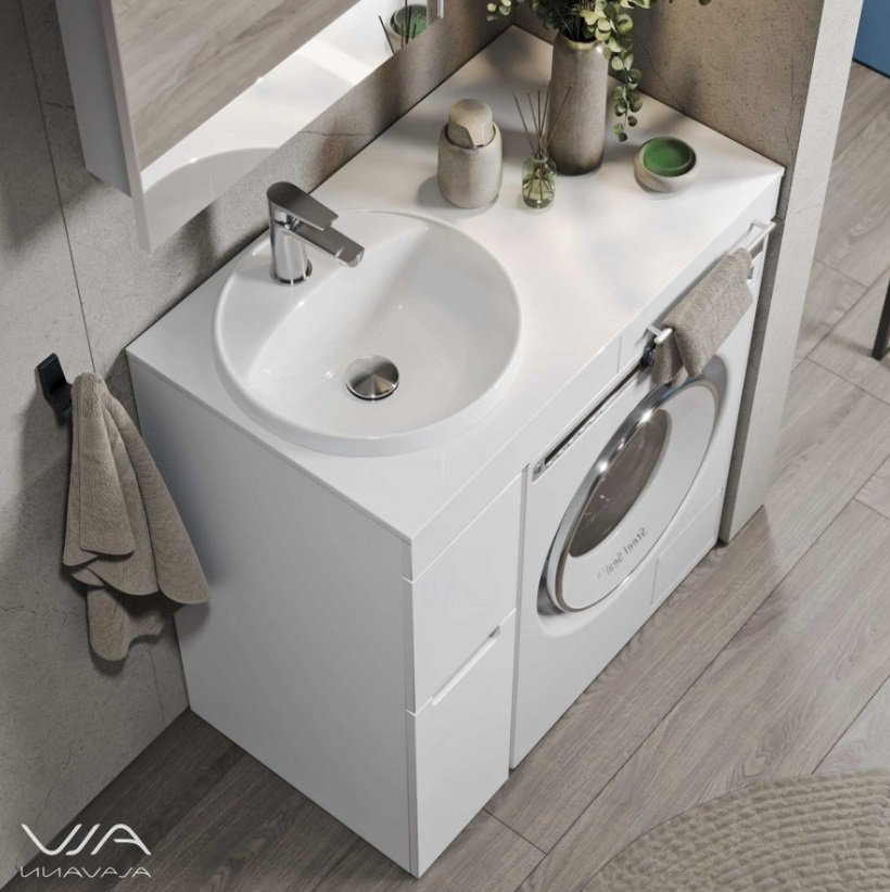 Тумба с раковиной Alavann Cosmetic 90 L под стиральную машину, напольная, глянцевая белая