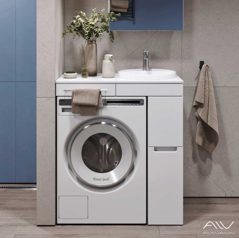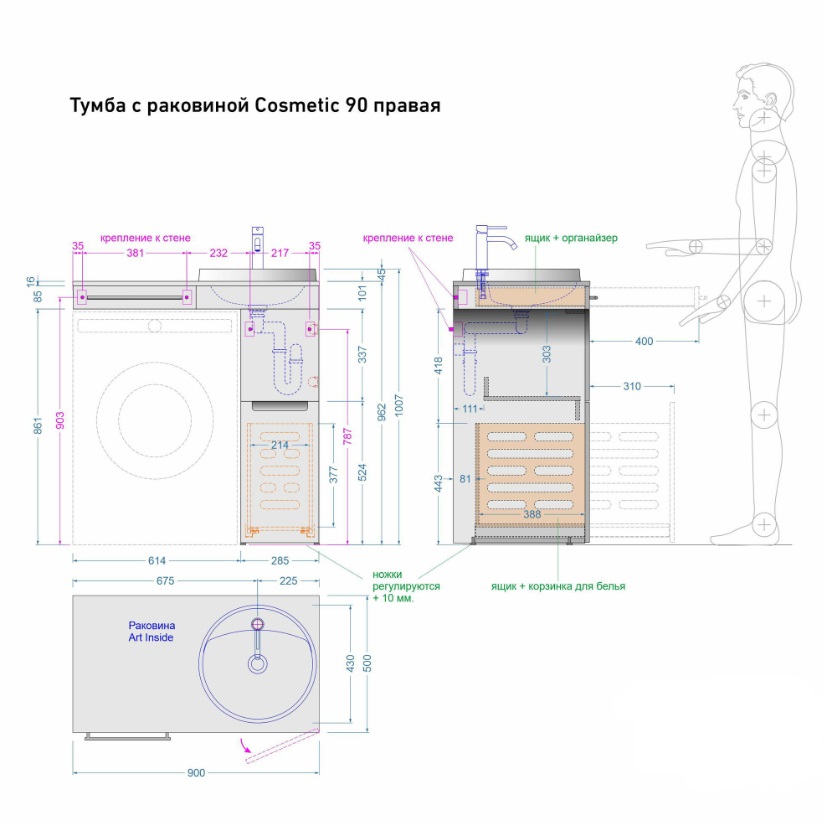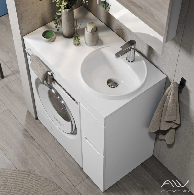 Тумба с раковиной Alavann Cosmetic 90 R под стиральную машину, напольная, глянцевая белая