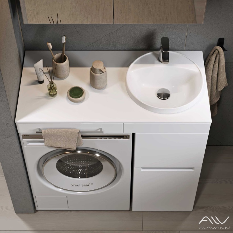 Тумба с раковиной Alavann Cosmetic 90 R под стиральную машину, напольная, глянцевая белая |