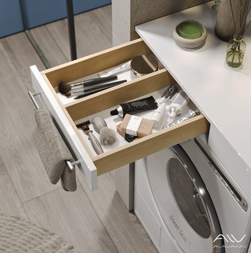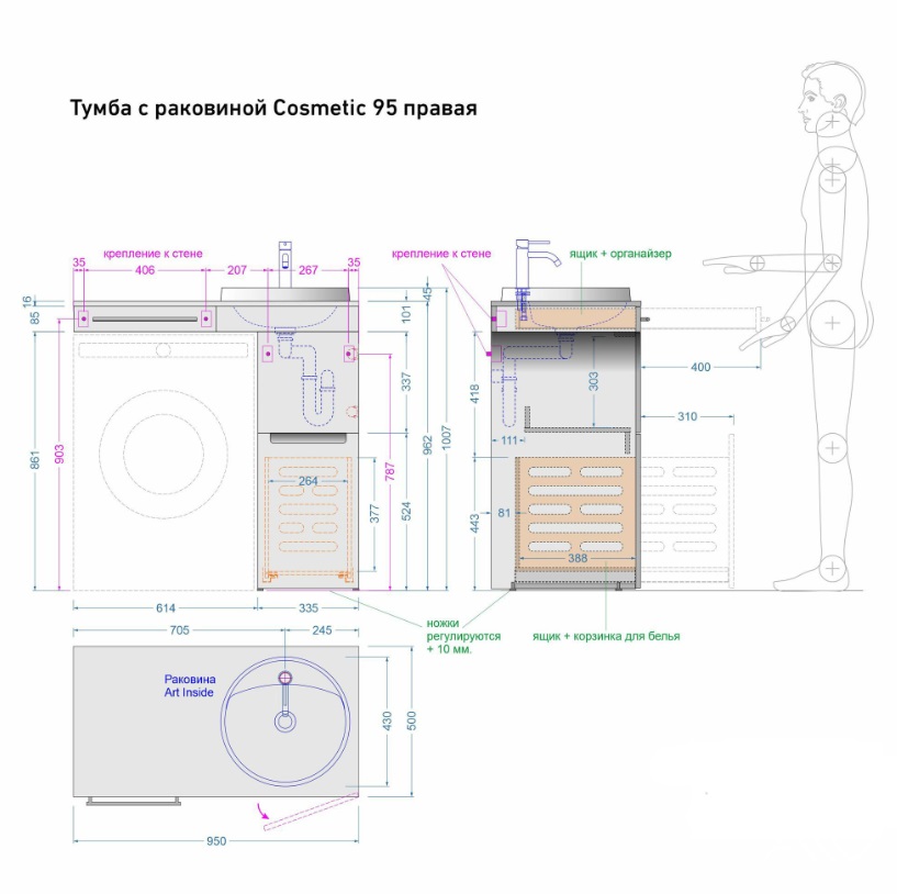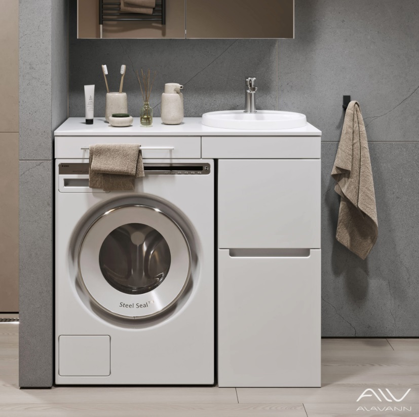 Тумба с раковиной Alavann Cosmetic 95 R под стиральную машину, напольная, глянцевая белая