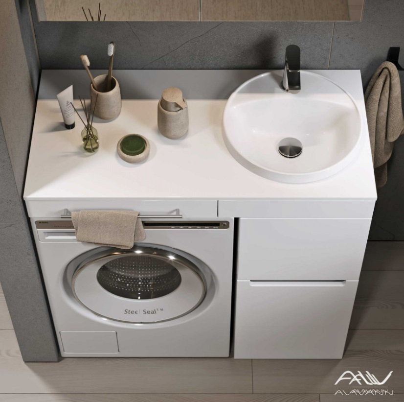 Тумба с раковиной Alavann Cosmetic 95 R под стиральную машину, напольная, глянцевая белая |