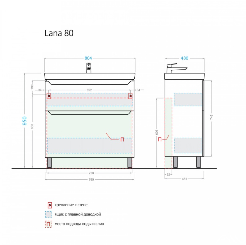Тумба с раковиной Lana 80 см для ванной белого цвета с гладким глянцевым фасадом и двумя выдвижными ящиками. Вместо наружных ручек дизайнеры использовали современные удобные зацепы. Ящики тумбочки с умывальником благодаря своему размеру практичны и функциональны. Внутри они отделаны фирменным материалом "интерьерный лен". Ящики на направляющих Hettich c доводчиками, с разделителями для гармоничного размещения необходимых принадлежностей.