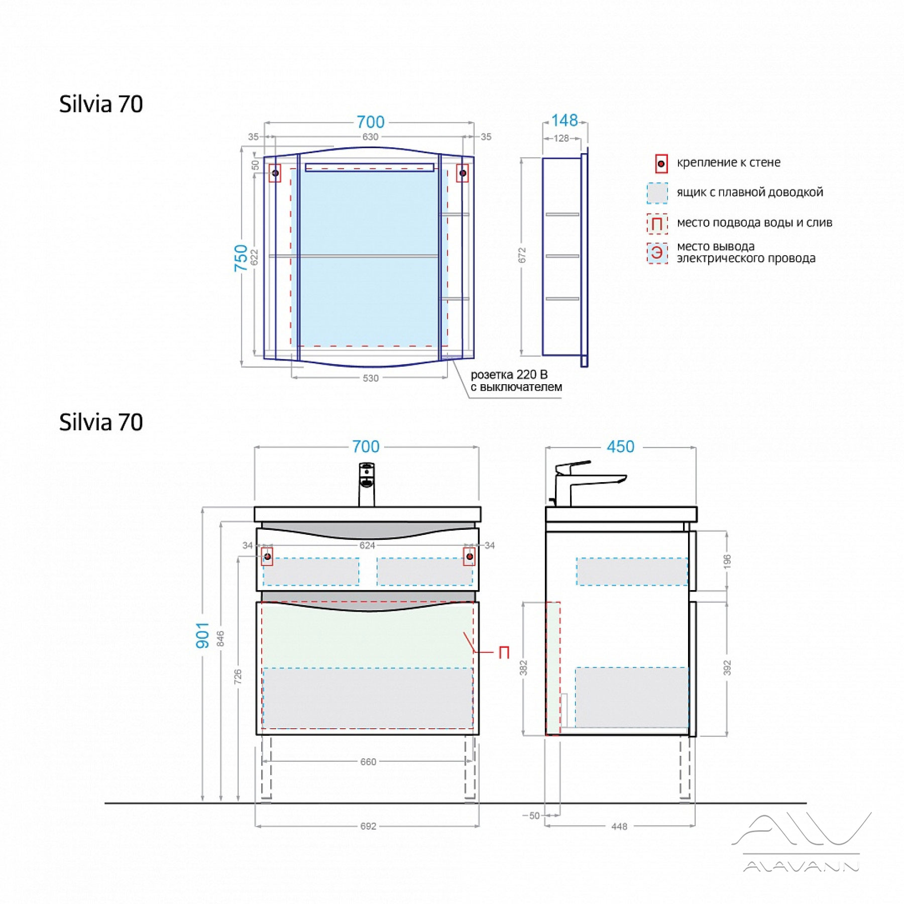 Корпус тумбы для ванной (размер 70) изготовлен из ДСП, фасады и боковины – из МДФ. Фасад изделия окрашен белой глянцевой эмалью. Тумба Silvia прекрасно сочетается с зеркальными шкафами и зеркалами из других коллекций мебели компании Alavann.