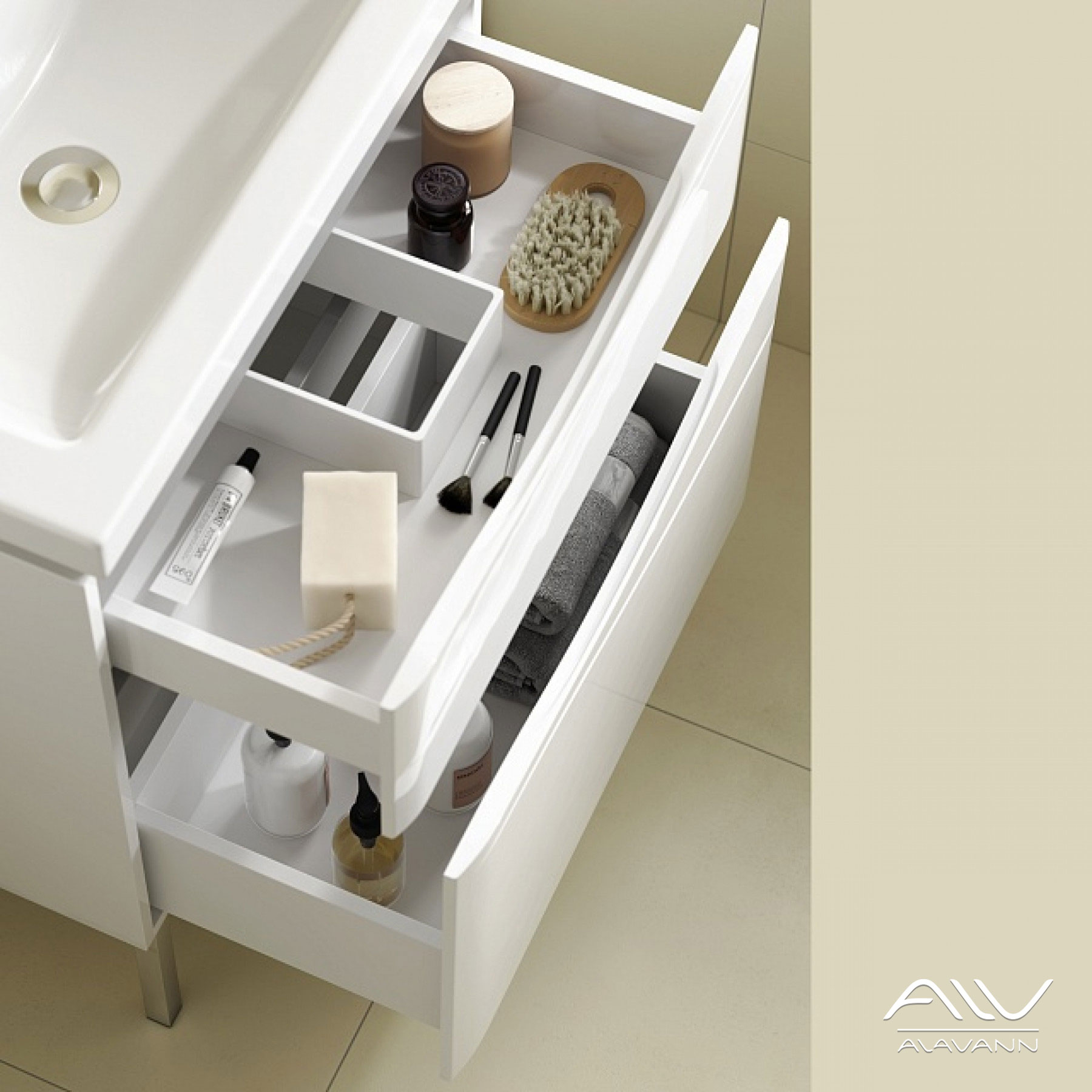 Два функциональных удобных выдвижных ящика на направляющих с доводчиками. На фасадах отсутствуют ручки и другая фурнитура, вместо этого предусмотрен удобный зацеп.