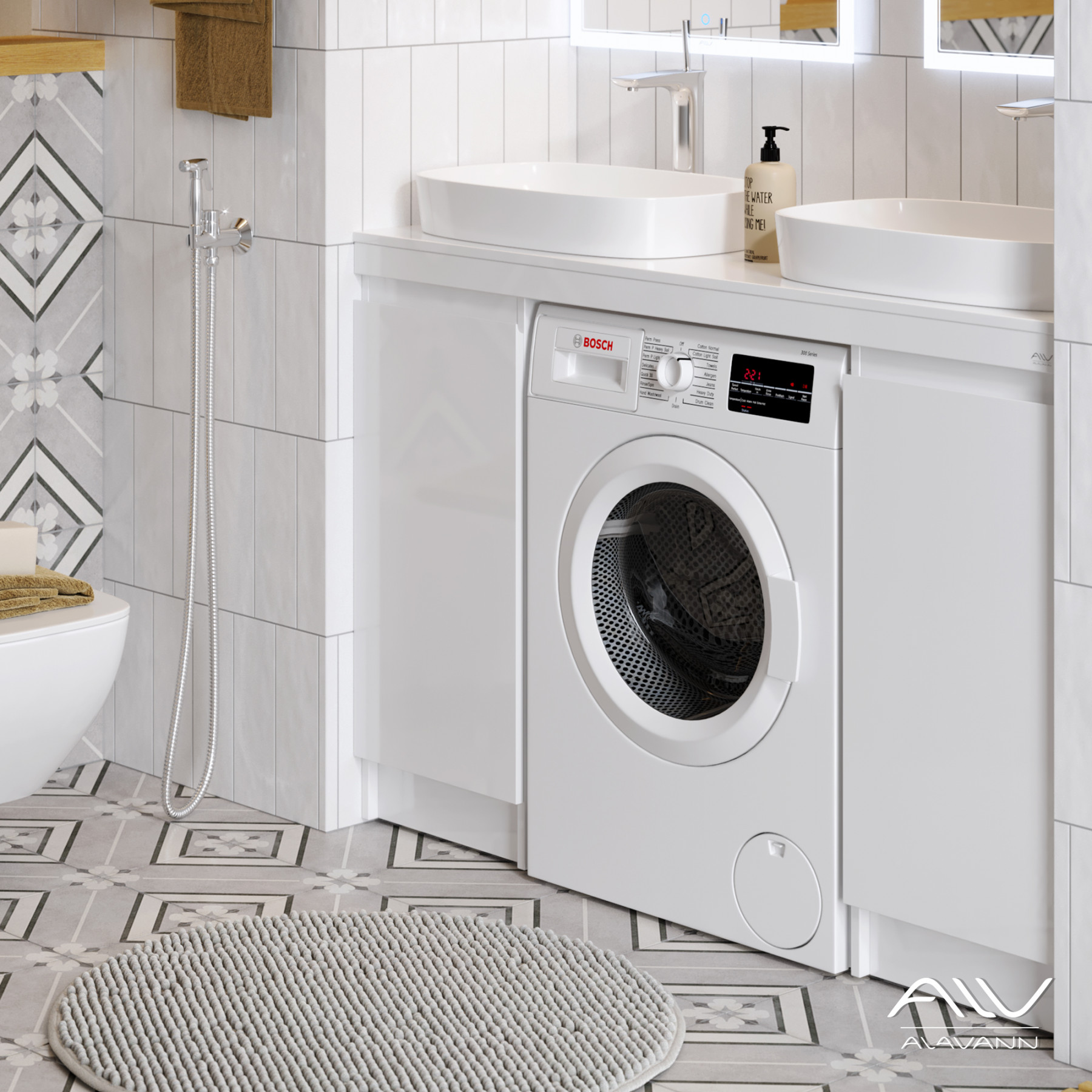 Двойная тумба под стиральную машину комплектуется двумя умывальниками Купер 56 (производство: Kirovit Россия). Возможно различное исполнение столешницы: МДФ со шпоном, а также столешница из камня. Толщина столешницы 60 мм.