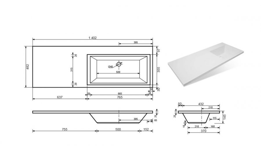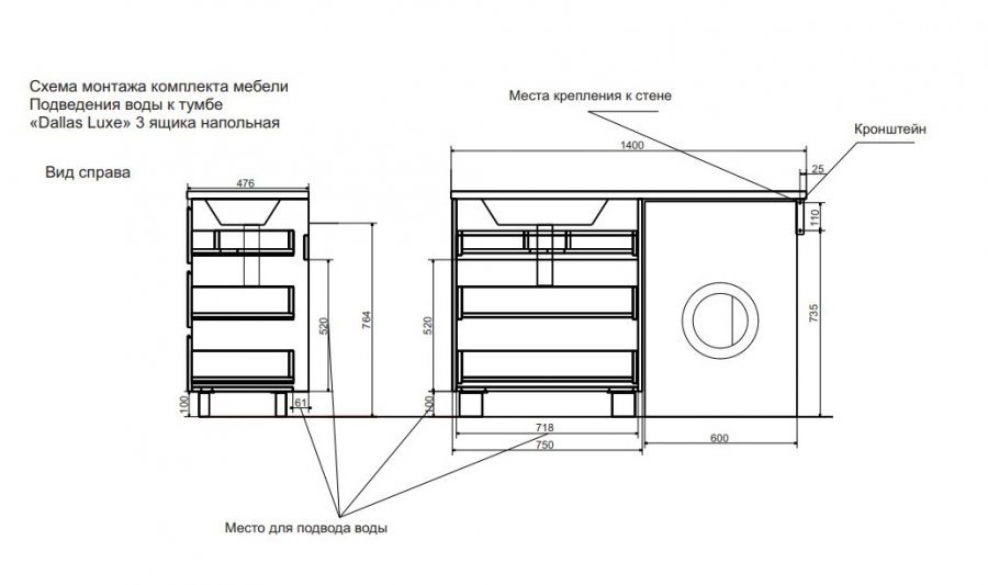 Тумба с раковиной Эстет Dallas Luxe 140 R напольная, 3 ящика, белая, с кронштейном |