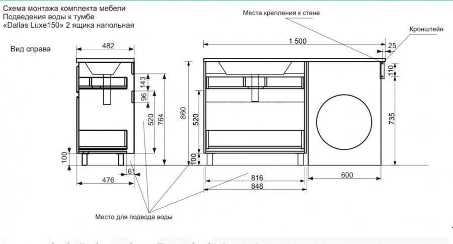 Тумба с раковиной Эстет Dallas Luxe 150 R напольная, 2 ящика, белая, с кронштейном |