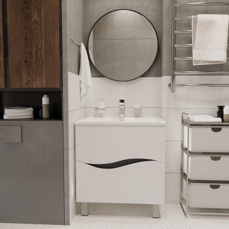 Коллекция представлена подвесными и напольными тумбами, а также вместительным пеналом. Ширина тумб позволяет комфортно обустроить как небольшие, так и просторные ванные комнаты.