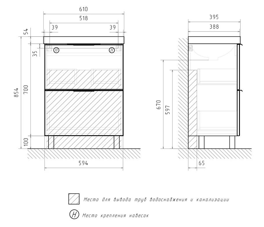 Тумба с раковиной Volna Geometry 60 напольный, 2 ящика, белый |