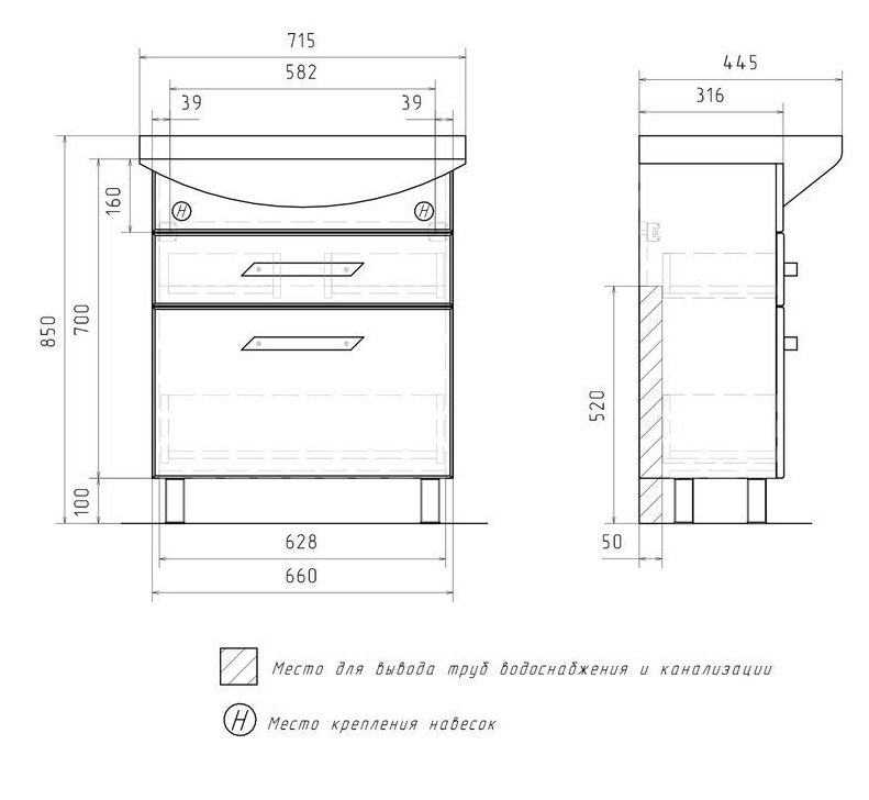 Тумба с раковиной Volna Onda 70 напольный, 2 ящика, белый |