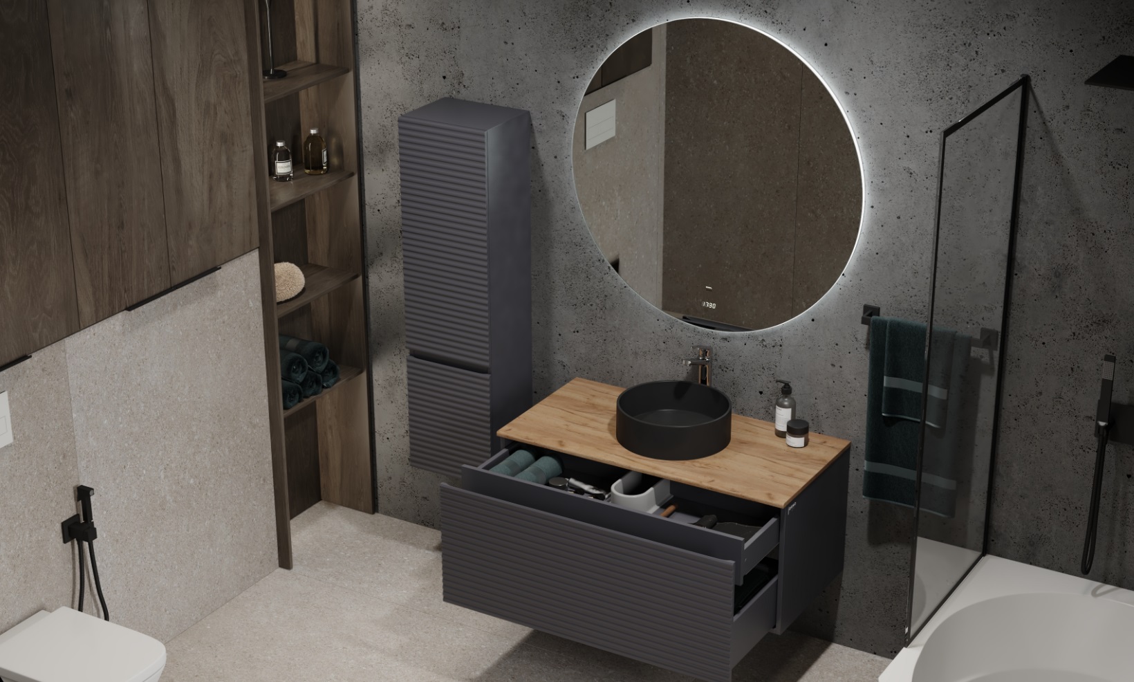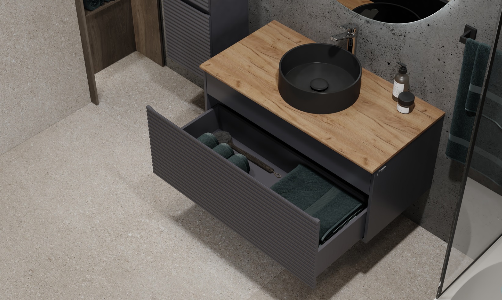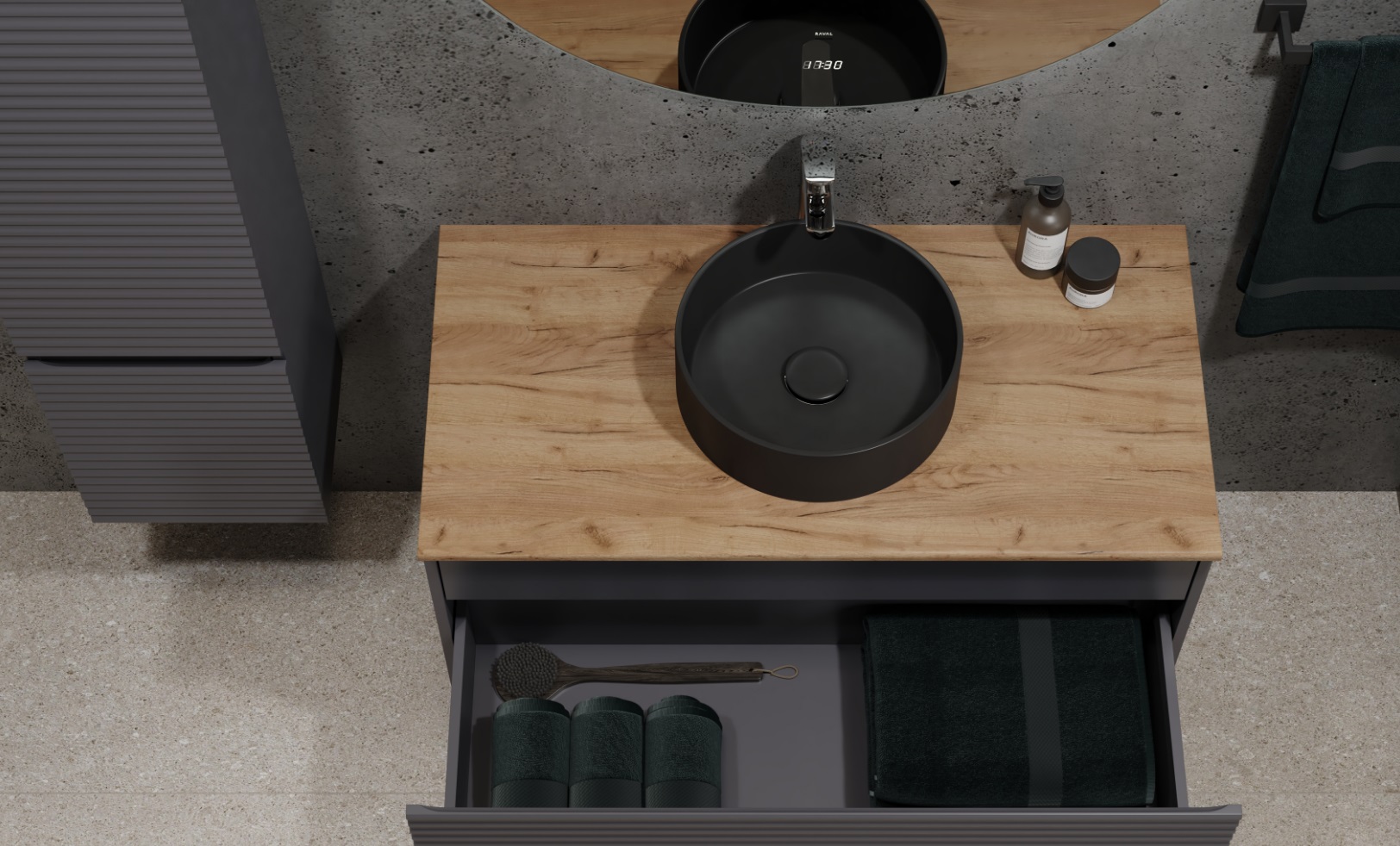 Простой и лаконичный, но в то же время стильный, современный дизайн позволят комплектам вписаться практически в любой интерьер. Сочетание деревянной богатой текстуры столешницы с четкими геометричными линиями на фасадах корпуса создает эффектный внешний вид коллекции и отражает дизайнерскую задумку. Тумба выполнена из влагостойких материалов, столешница -из МДФ в пленке ПВХ. Вместительный выдвижной ящик оснащен внутри скрытым ящиком для хранения мелочей.
