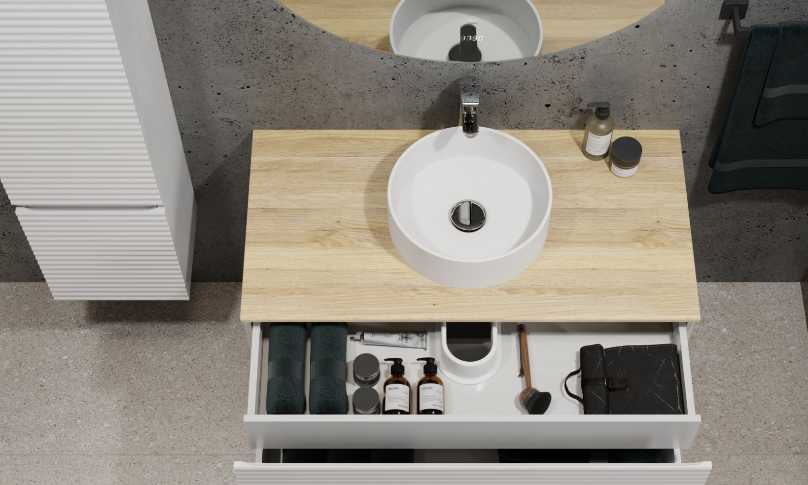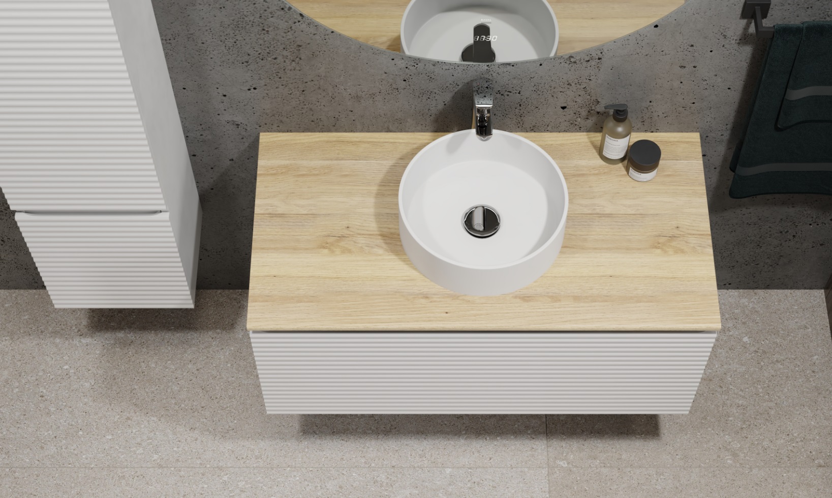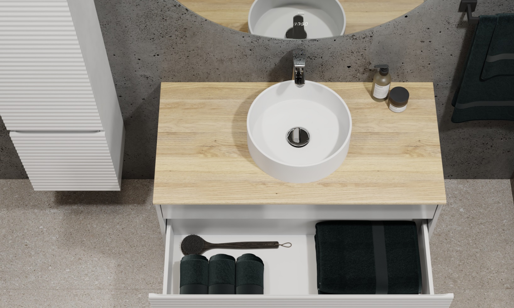 Простой и лаконичный, но в то же время стильный, современный дизайн позволят комплектам вписаться практически в любой интерьер. Сочетание деревянной богатой текстуры столешницы с четкими геометричными линиями на фасадах корпуса создает эффектный внешний вид коллекции и отражает дизайнерскую задумку. Тумба выполнена из влагостойких материалов, столешница -из МДФ в пленке ПВХ. Вместительный выдвижной ящик оснащен внутри скрытым ящиком для хранения мелочей.