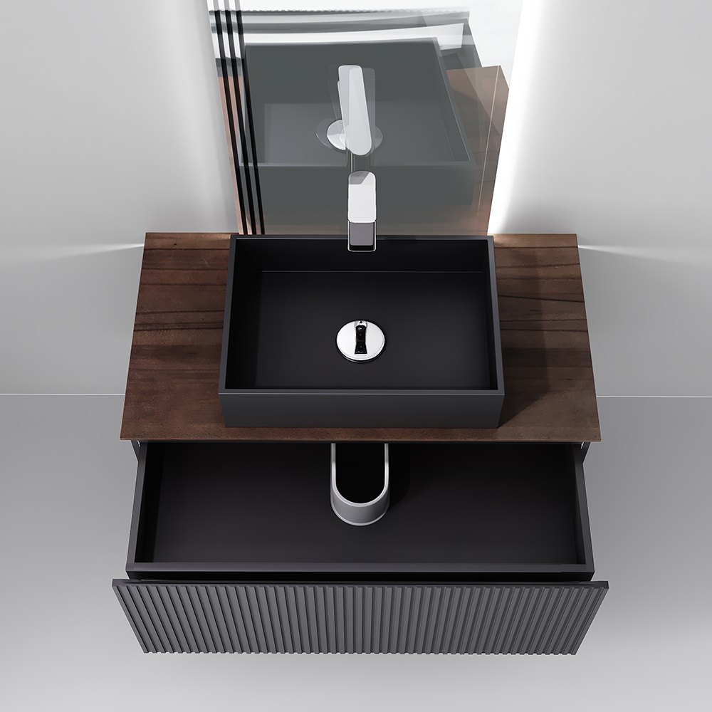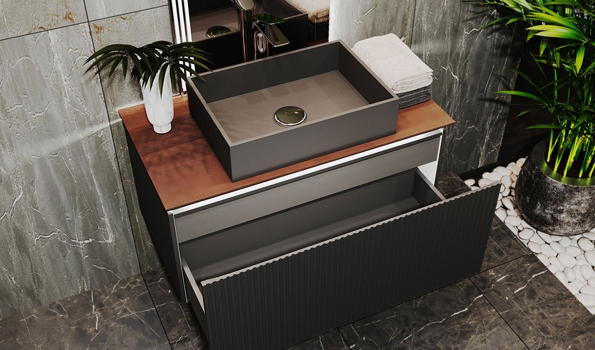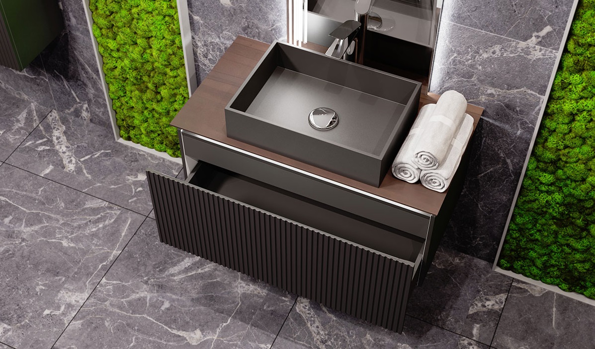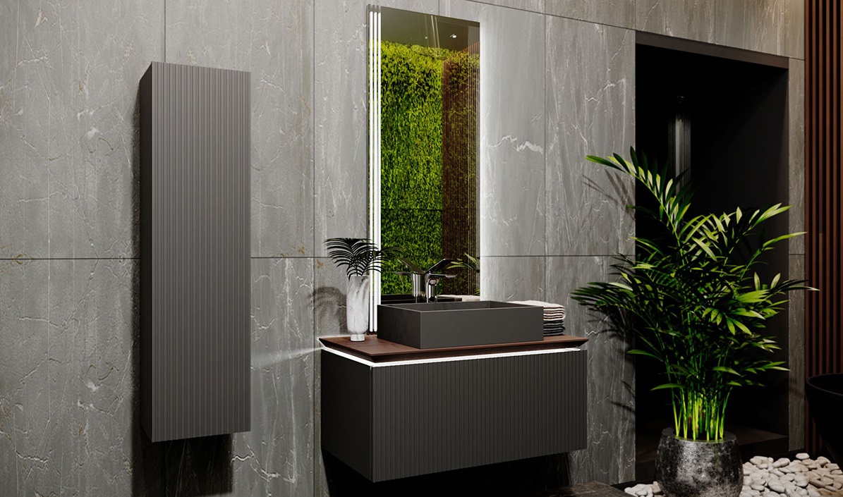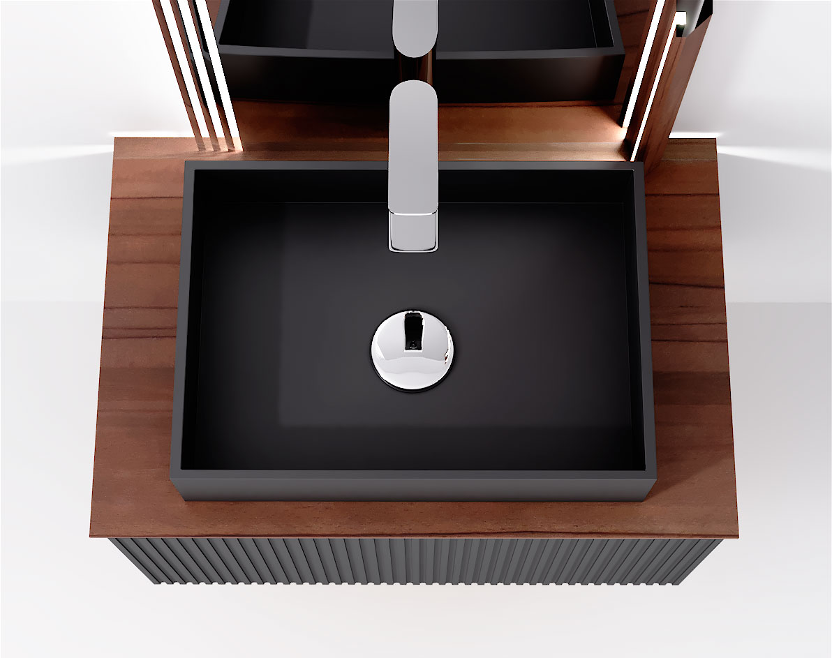 Фасад и боковины тумбы комплекта выполнены из МДФ, покрытого матовой пленкой графитового оттенка.Столешница из цельного массива бука, которому придали темный оттенок и влагостойкость, оснащена подсветкой. Внутри тумбы есть скрытый ящик. Тумба внутри и снаружи выполнена в одном цвете, что создает цельность образа.