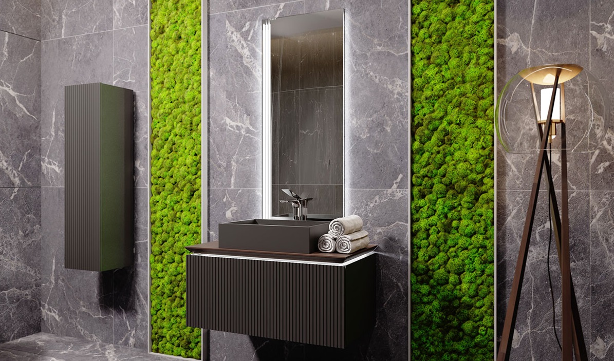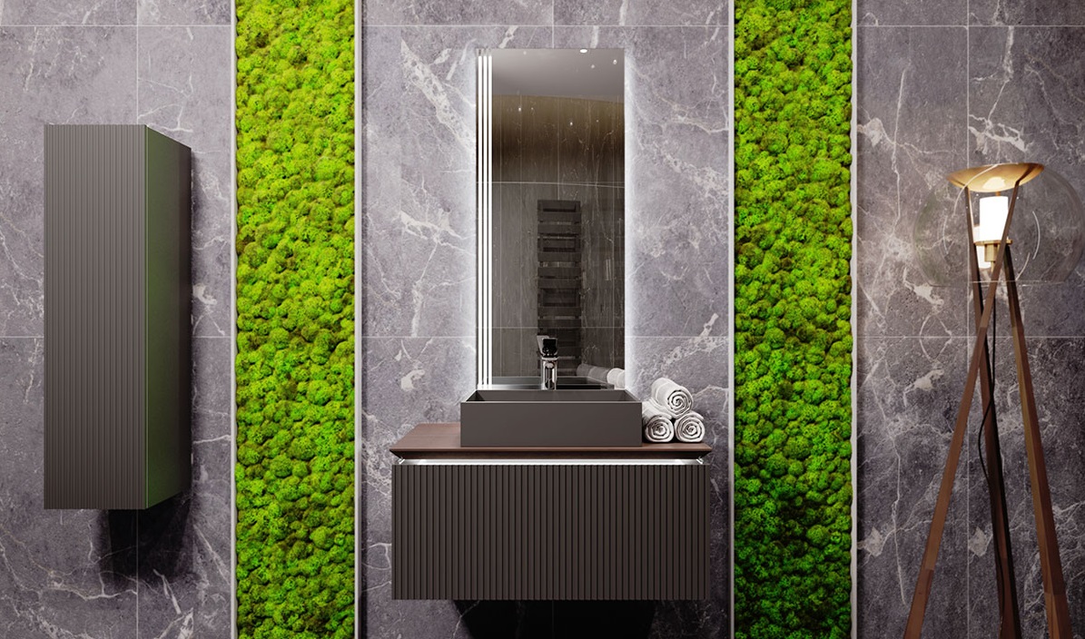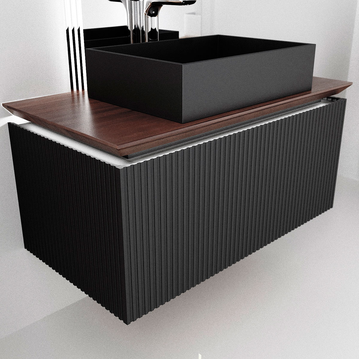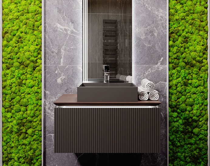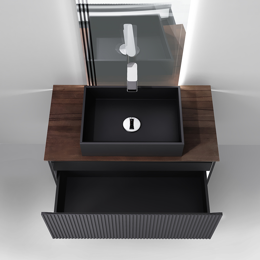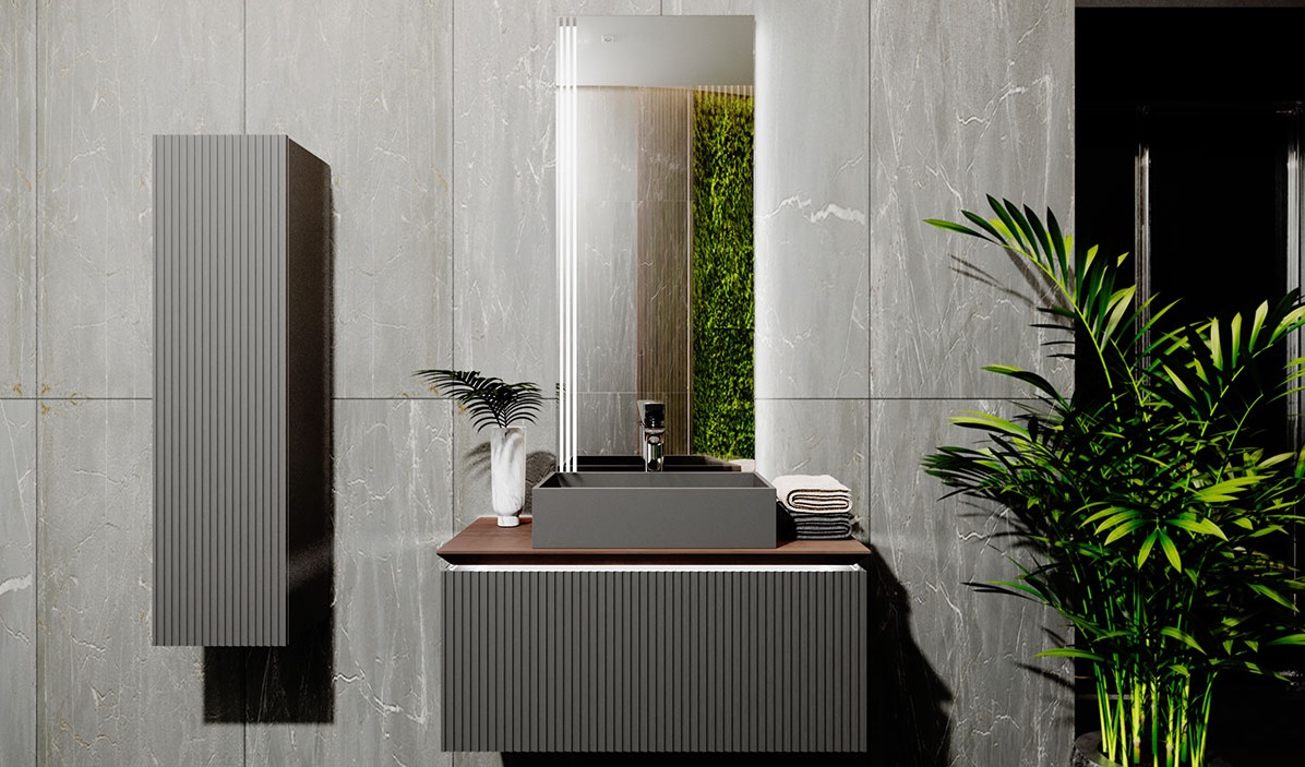 Фасад и боковины тумбы комплекта выполнены из МДФ, покрытого матовой пленкой графитового оттенка.Столешница из цельного массива бука, которому придали темный оттенок и влагостойкость, оснащена подсветкой. Внутри тумбы есть скрытый ящик. Тумба внутри и снаружи выполнена в одном цвете, что создает цельность образа.