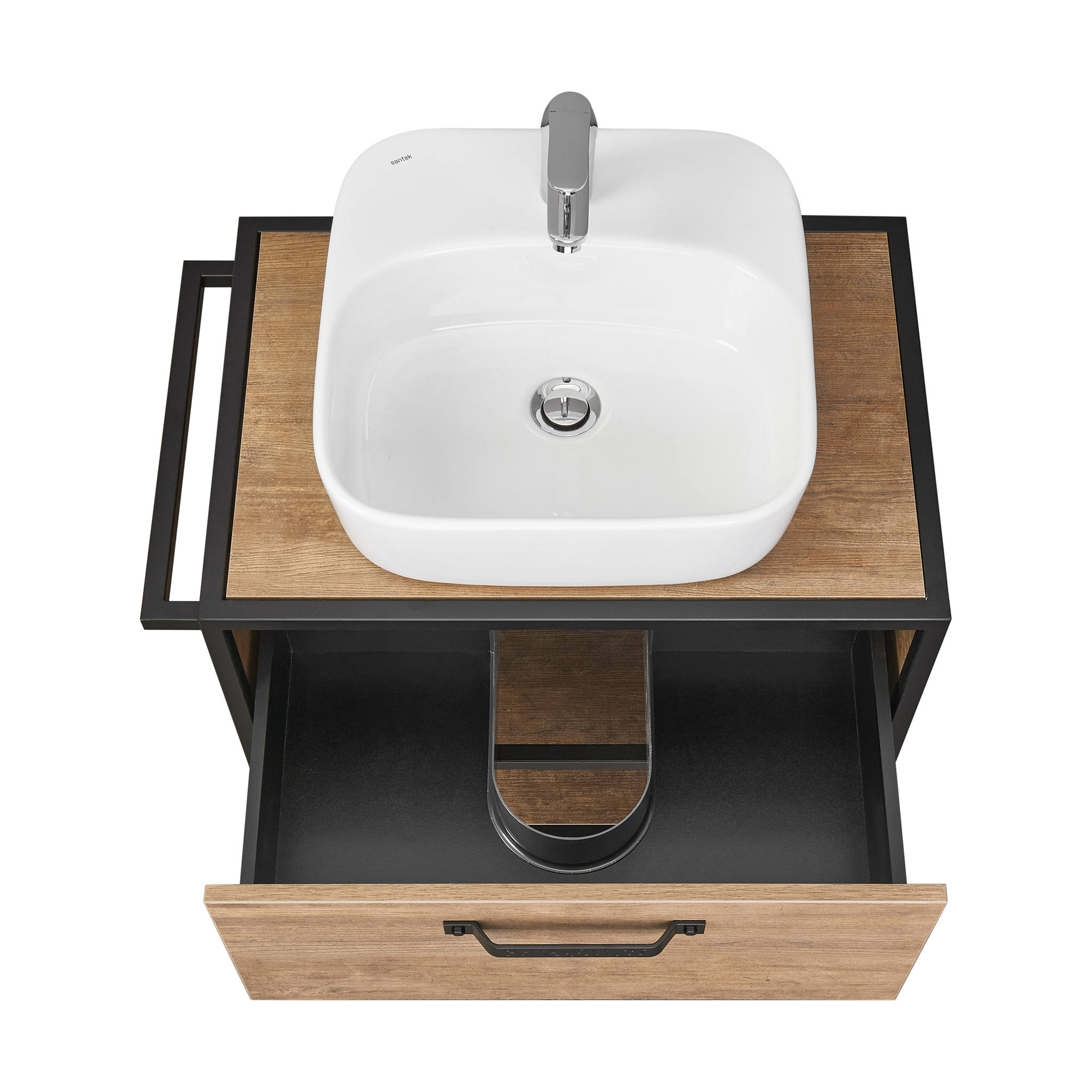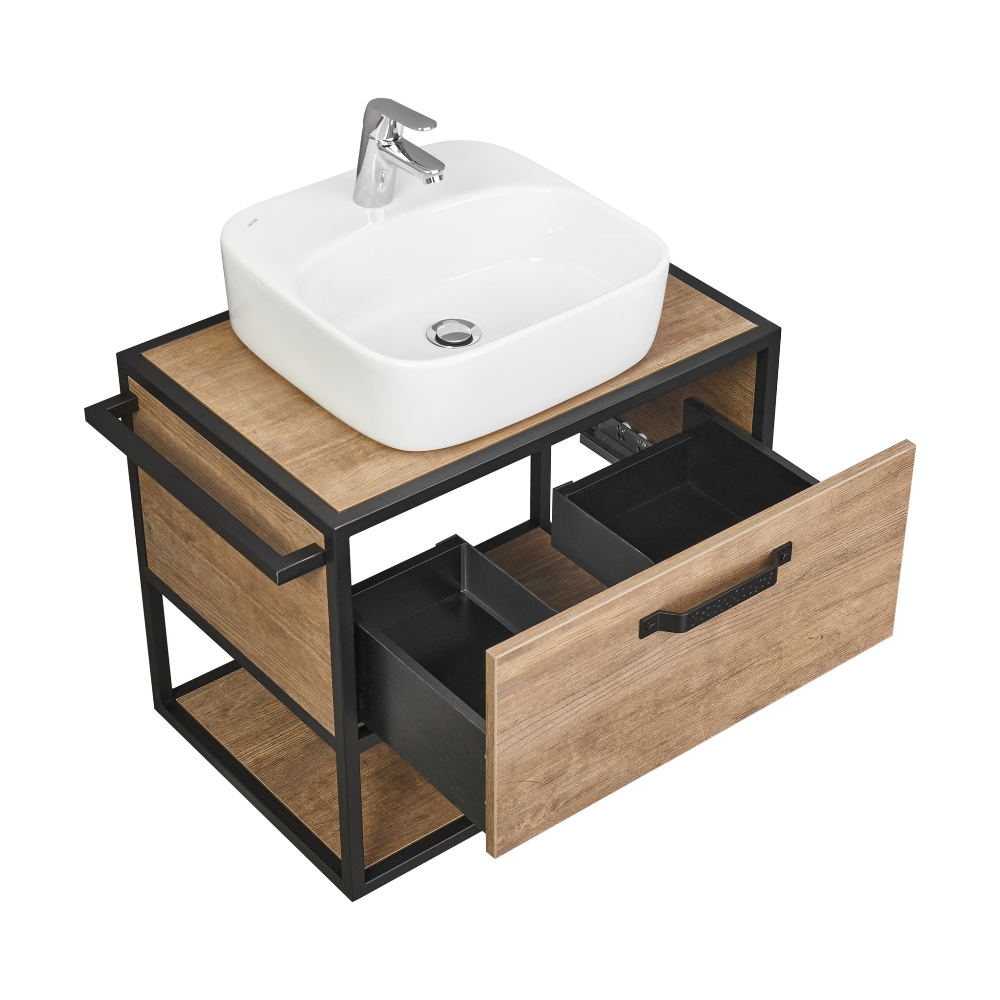 Тумба Лофт Фабрик 65 в цвете Дуб Кантри – это сочетание насыщенного древесного декора и благородства металла. Удобный вместительный ящик, снабженный направляющими плавного выдвижения, и открытая нижняя полка позволят разместить все необходимое. Для данной тумбы доступно два варианта комплектации: с раковиной Фабиа 65 из прочного литого мрамора и с накладной керамической раковиной на столешницу (столешница заказывается отдельно). Оригинальная ручка идеально сочетается с металлическими черными профилями и полотенцедержателем. Полотенцедержатель можно установить опционально по желанию клиента слева или справа.
