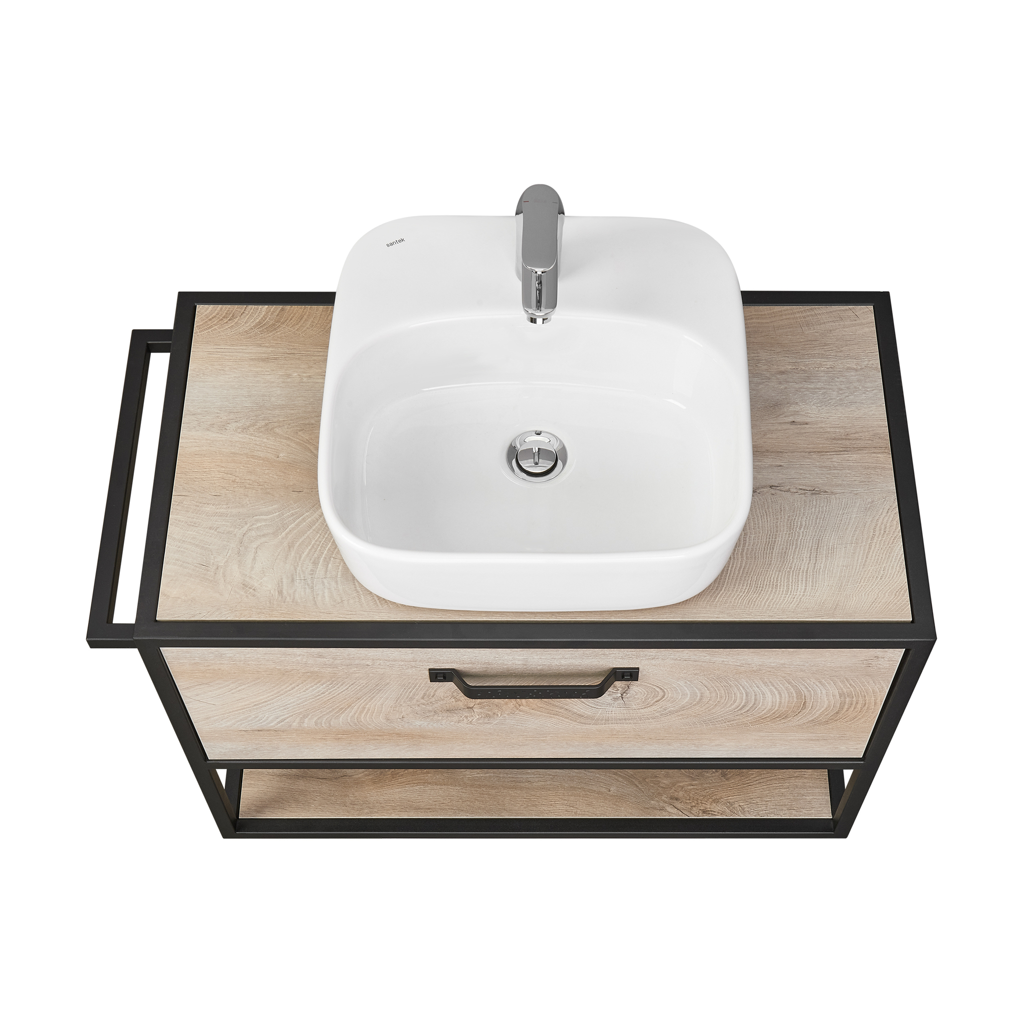 Тумба Лофт Фабрик 80 в цвете Дуб Эндгрейн – это сочетание насыщенного древесного декора и благородства металла. Удобный вместительный ящик, снабженный направляющими плавного выдвижения, и открытая нижняя полка позволят разместить все необходимое. Для данной тумбы доступно три варианта комплектации: с керамической раковиной Victoria от бренда Roca, с раковиной Фабиа 80 из прочного литьевого мрамора и с накладной керамической раковиной на столешницу, столешница заказывается отдельно. Оригинальная ручка идеально сочетается с металлическими черными профилями и полотенцедержателем. Полотенцедержатель можно установить опционально по желанию клиента слева или справа.