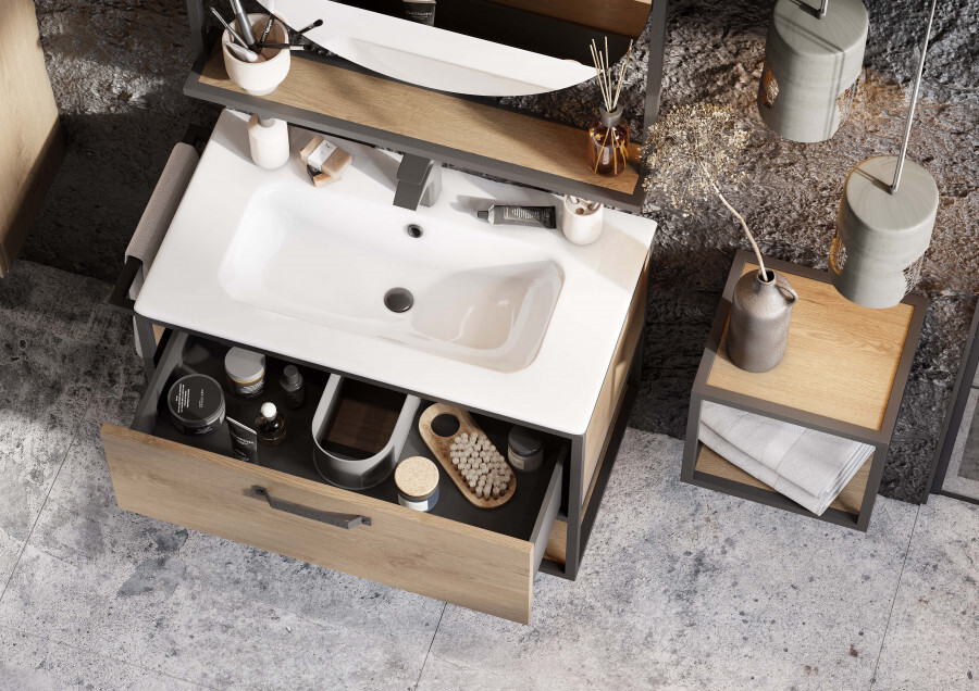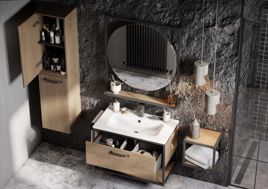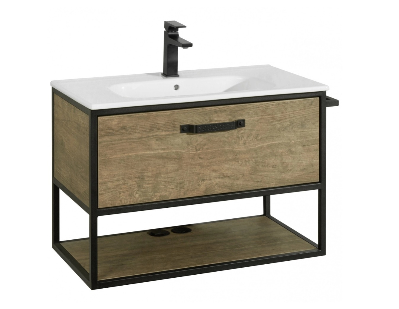Тумба Лофт Фабрик 80 в цвете Дуб Кантри – это сочетание насыщенного древесного декора и благородства металла. Удобный вместительный ящик, снабженный направляющими плавного выдвижения, и открытая нижняя полка позволят разместить все необходимое. Для данной тумбы доступно три варианта комплектации: с керамической раковиной Victoria от бренда Roca, с раковиной Фабиа 80 из прочного литьевого мрамора и с накладной керамической раковиной на столешницу, столешница заказывается отдельно. Оригинальная ручка идеально сочетается с металлическими черными профилями и полотенцедержателем. Полотенцедержатель можно установить опционально по желанию клиента слева или справа.