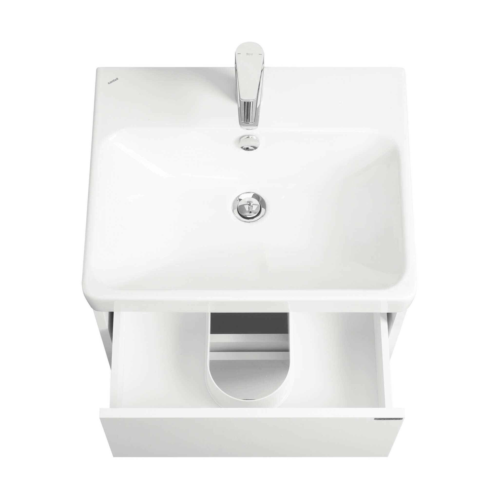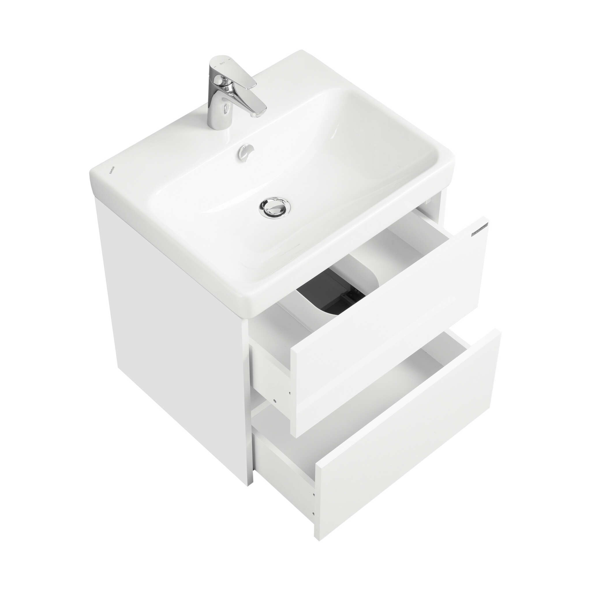 Тумба Сканди 55 выполнена в популярном минималистичном скандинавском стиле. Корпус тумбы выполнен из влагостойкой ЛДСП в белой матовой покраске, а фасады в белой глянцевой покраске. Конструктивно тумба состоит из 2 вместительных ящиков, установленных на направляющие с интегрированной системой push-to-open для комфортного использования. На тумбе нет выступающих деталей и фурнитуры, открытие ящиков реализовано нажатием на фасад. Тумба комплектуется белоснежной раковиной Адриана от бренда Santek. Раковина приобретается отдельно.