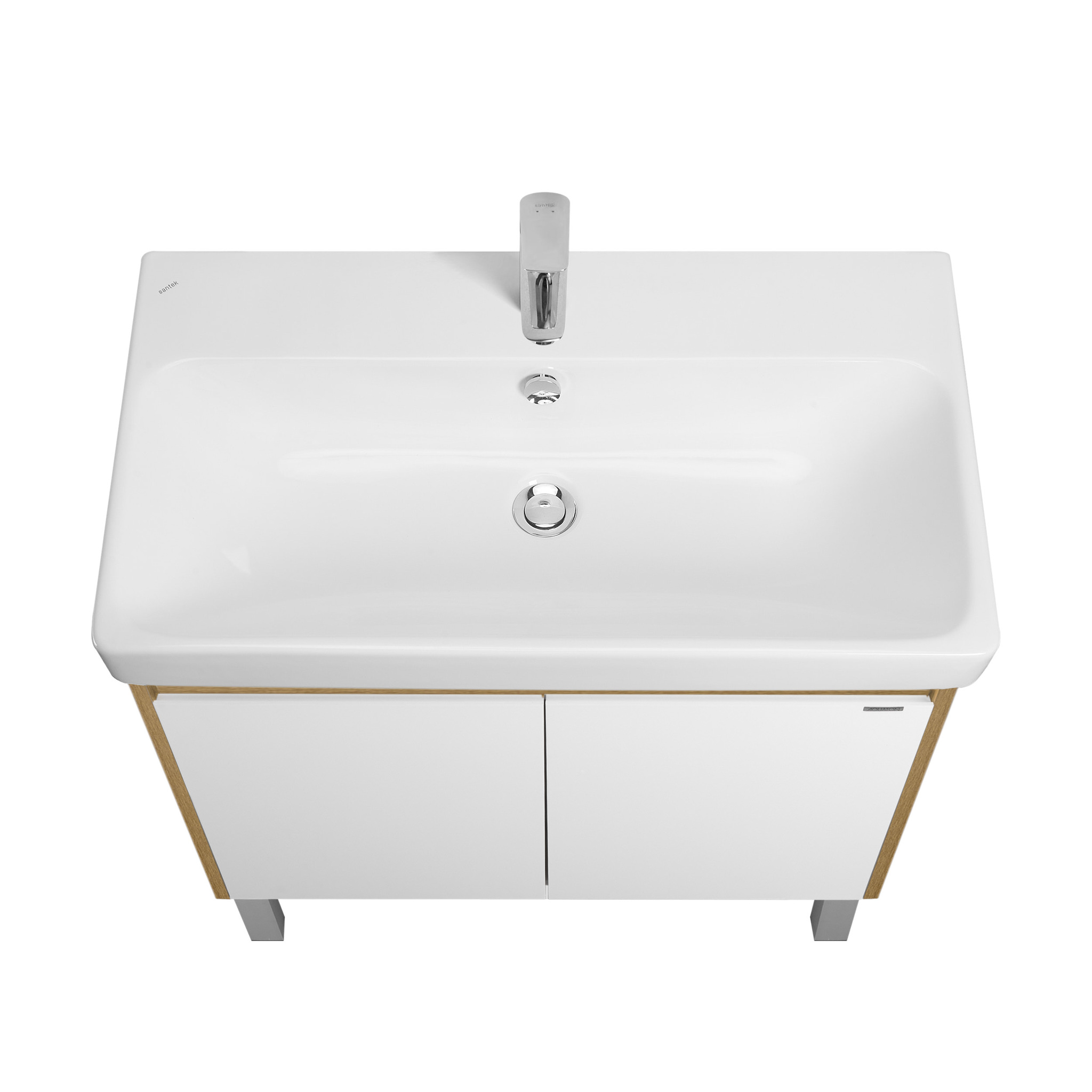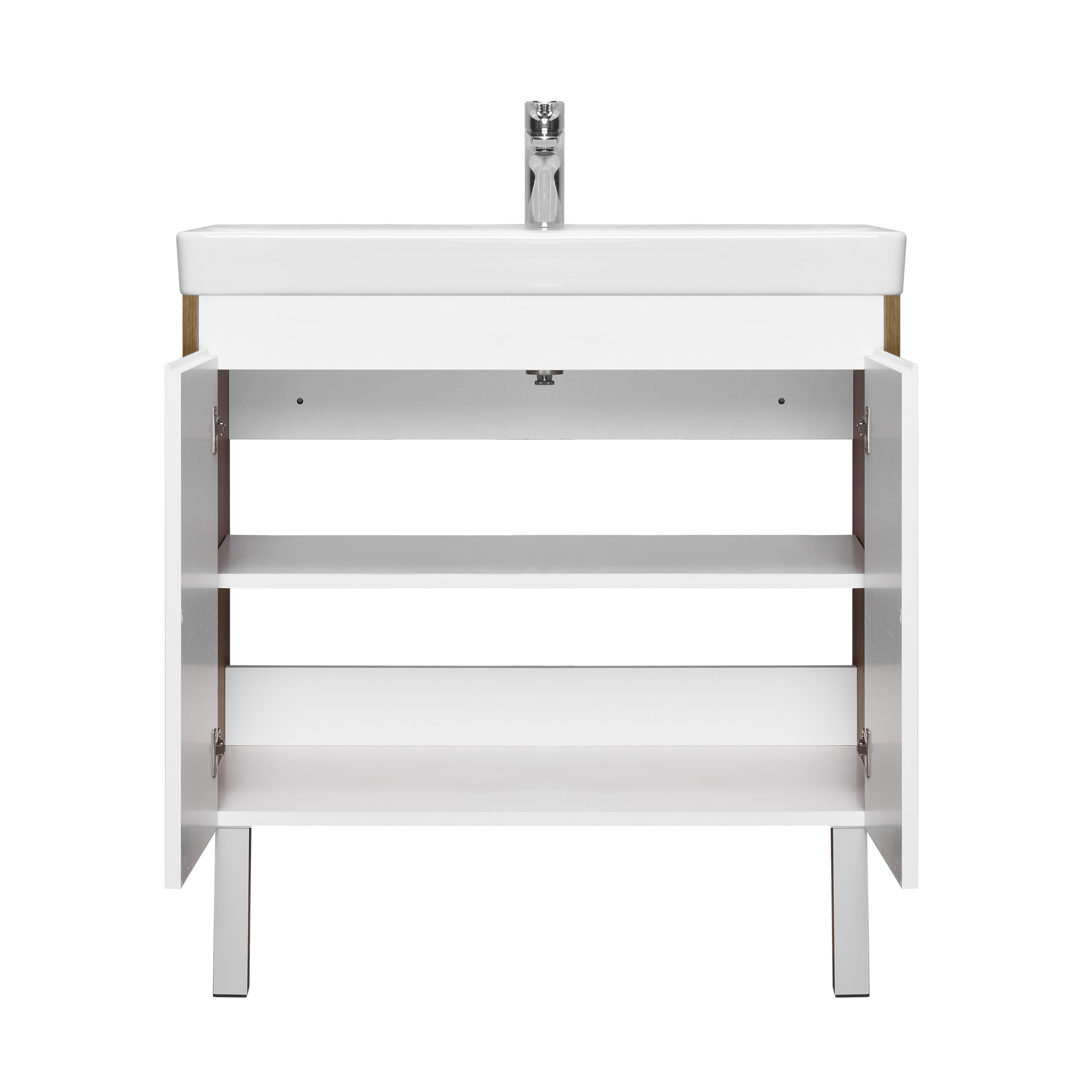 Тумба Сканди Doors 80 выполнена в популярном минималистичном скандинавском стиле. Корпус тумбы выполнен из влагостойкой ЛДСП в декоре натурального дерева, а фасады-створки в белой глянцевой покраске. За створками скрывается вместительное пространство, разделенное на две части регулируемой по высоте полкой из ВЛДСП. На тумбе нет выступающих деталей и фурнитуры, открытие створок реализуется за фасад, верхняя часть которого обработана под ручку L-профиль. К тумбе идеально подходит белоснежная раковина Адриана от бренда Santek. Раковина продается отдельно.