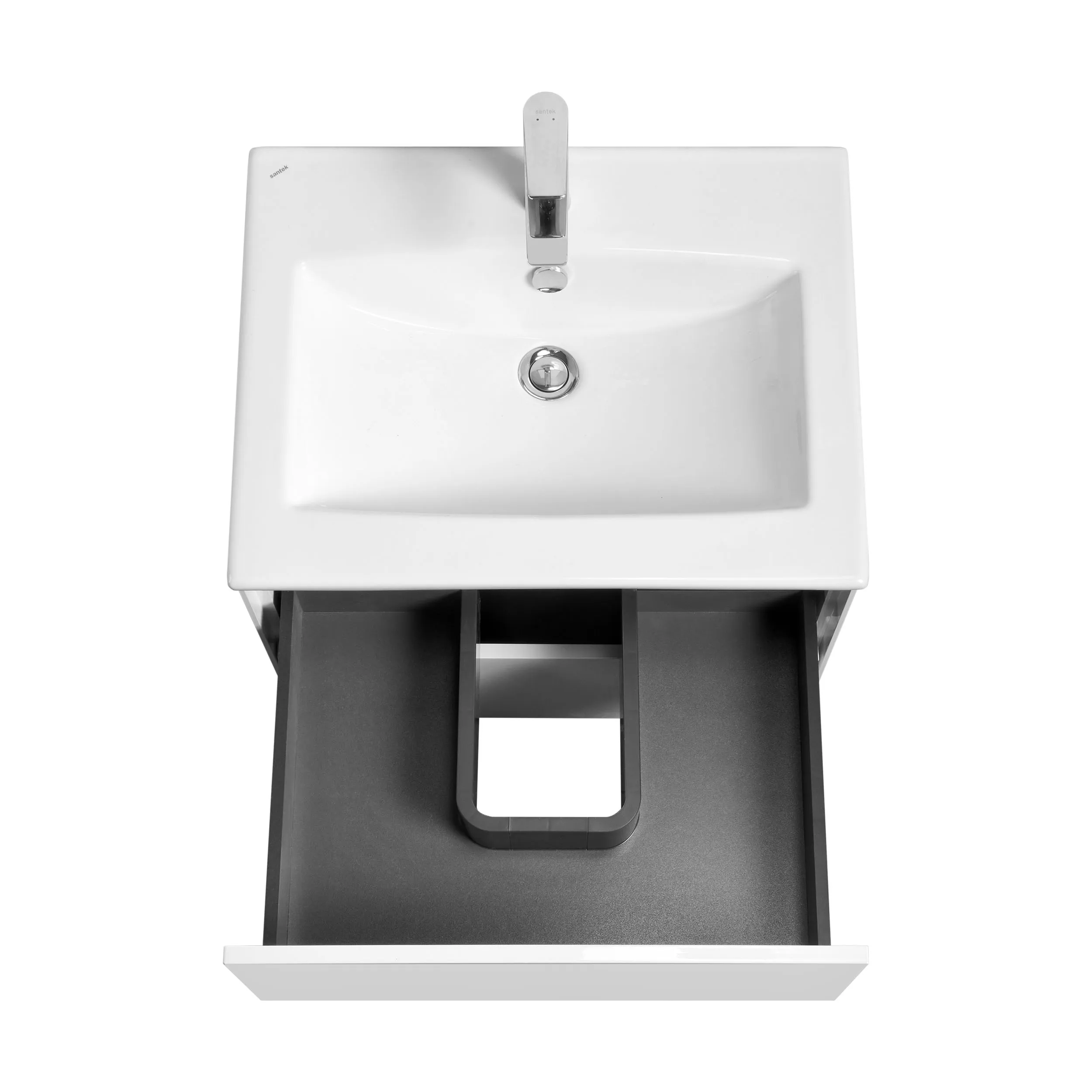Тумба Сохо 60 функционально состоит из двух вместительных ящиков, оснащенных системой push to open, обеспечивающей надежное, комфортное и бесшумное закрывание. Фасады изделия выполнены из МДФ в белой глянцевой покраске, корпус из ламинированной влагостойкой ДСП в покраске белый глянец. Верхний и нижний ящики позволяют содержать косметические средства в идеальном порядке. Дополняет тумбу стильная раковина Элина от бренда Santek с удобной чашей. Все внутренние детали тумбы выполнены в цвете антрацит.