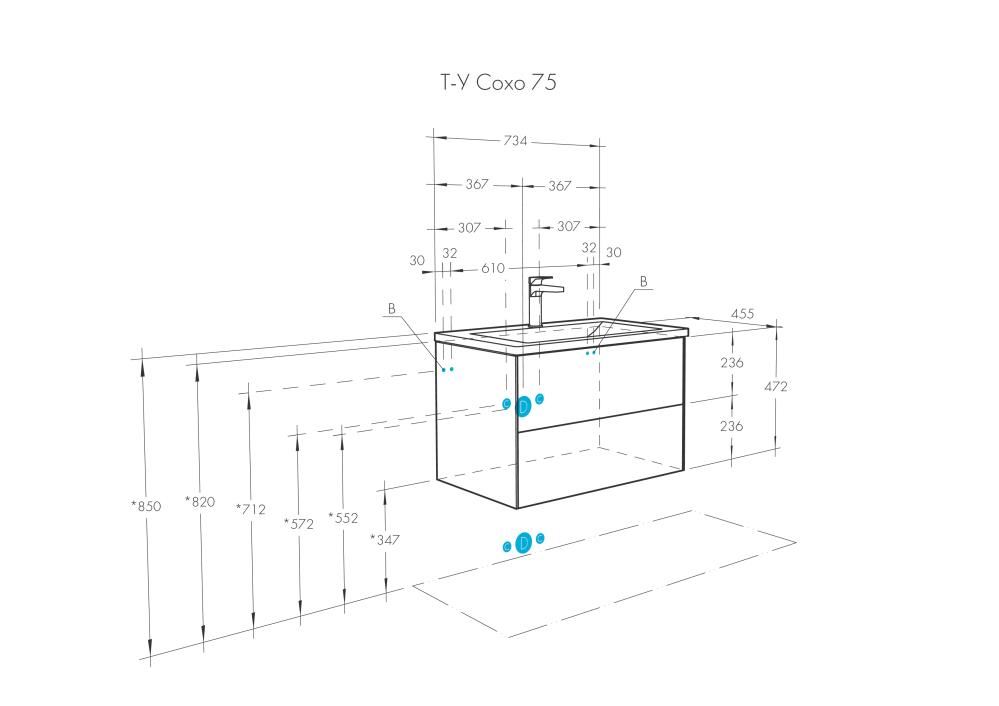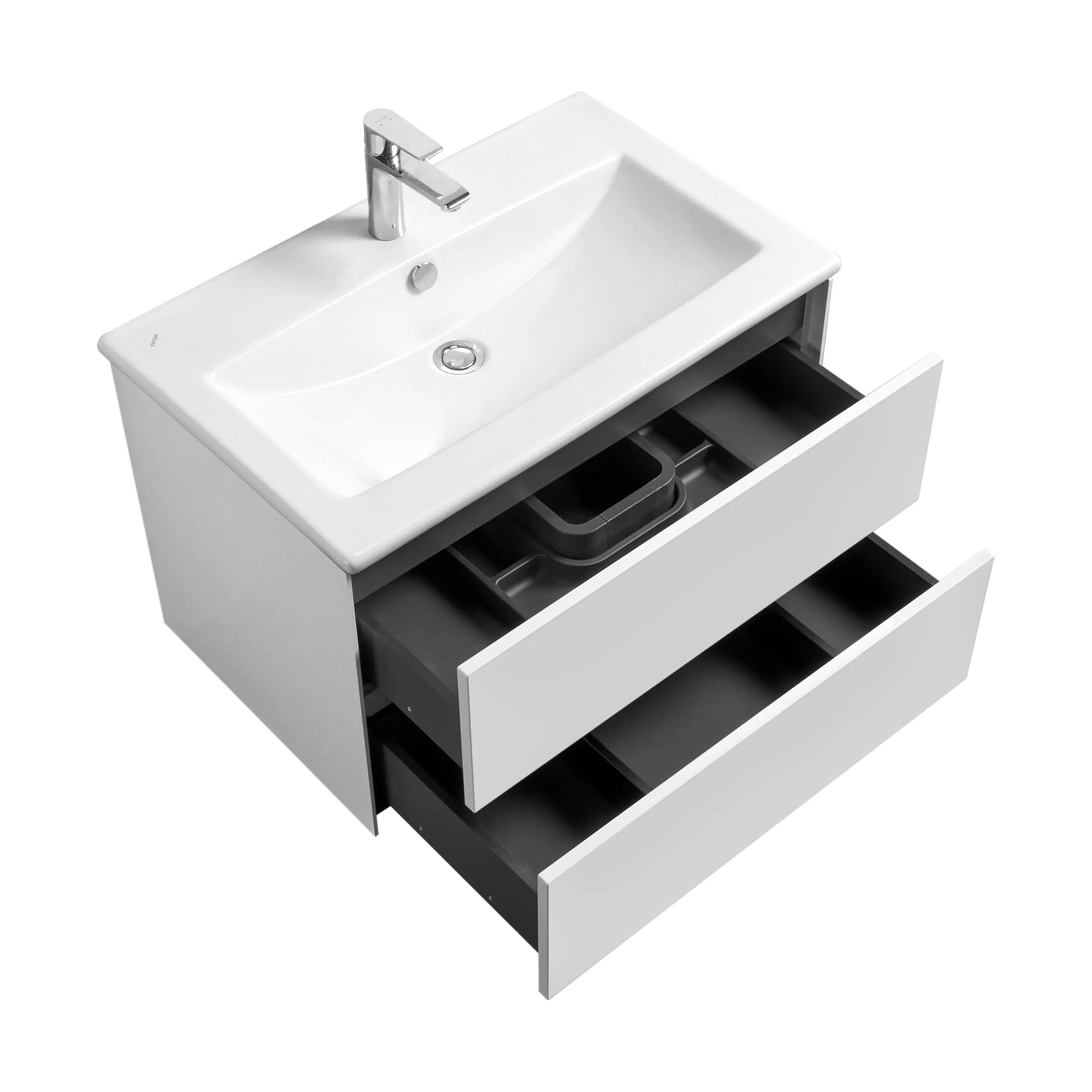 Тумба Сохо 75 функционально состоит из двух вместительных ящиков, оснащенных системой push to open, обеспечивающей надежное, комфортное и бесшумное закрывание. Фасады изделия выполнены из МДФ в белой глянцевой покраске, корпус из ламинированной влагостойкой ДСП в покраске белый глянец. Верхний и нижний ящики оснащены системой организации пространства, которая позволяет содержать косметические средства в идеальном порядке. Дополняет тумбу стильная раковина Элина от бренда Santek с удобной чашей. Все внутренние детали тумбы выполнены в цвете антрацит.