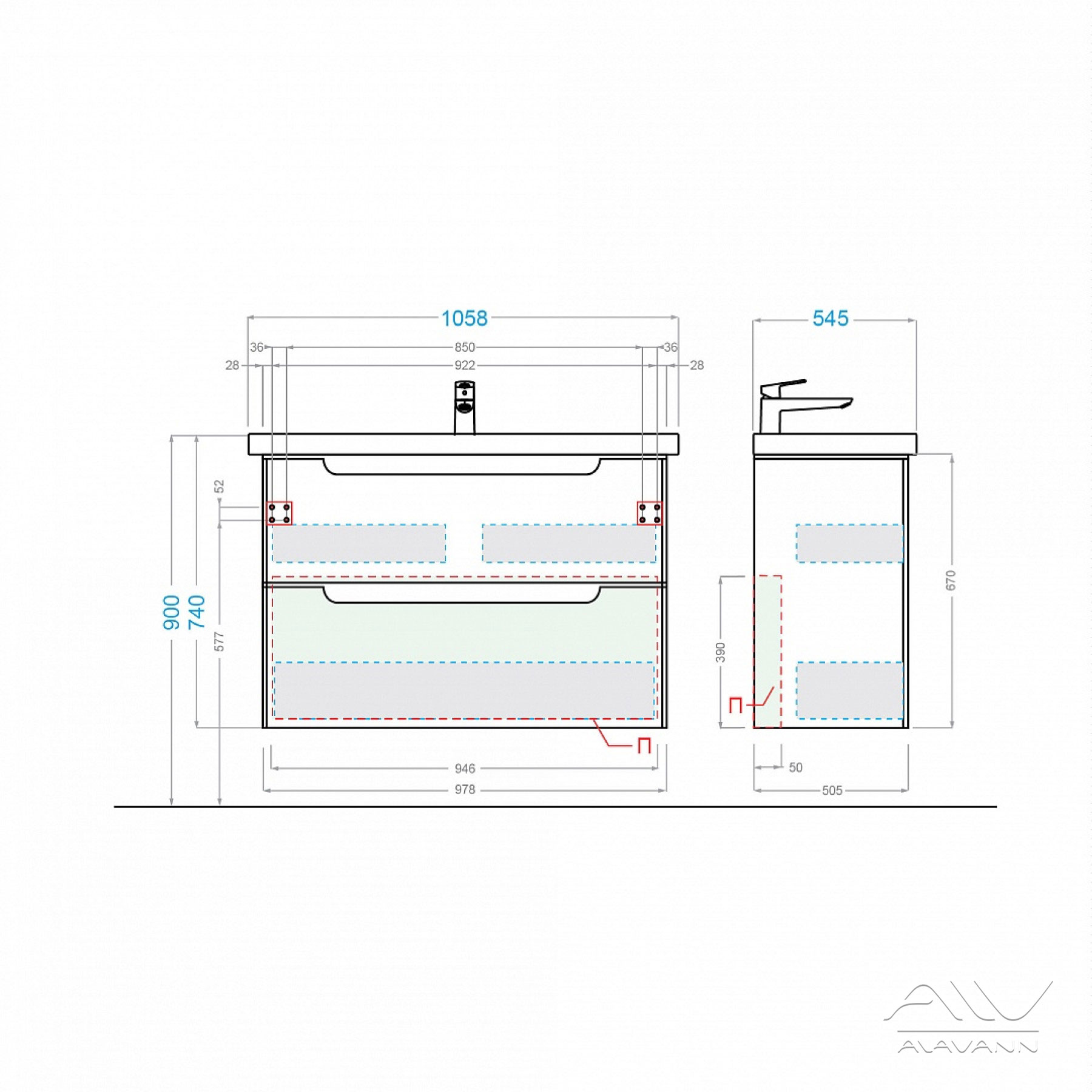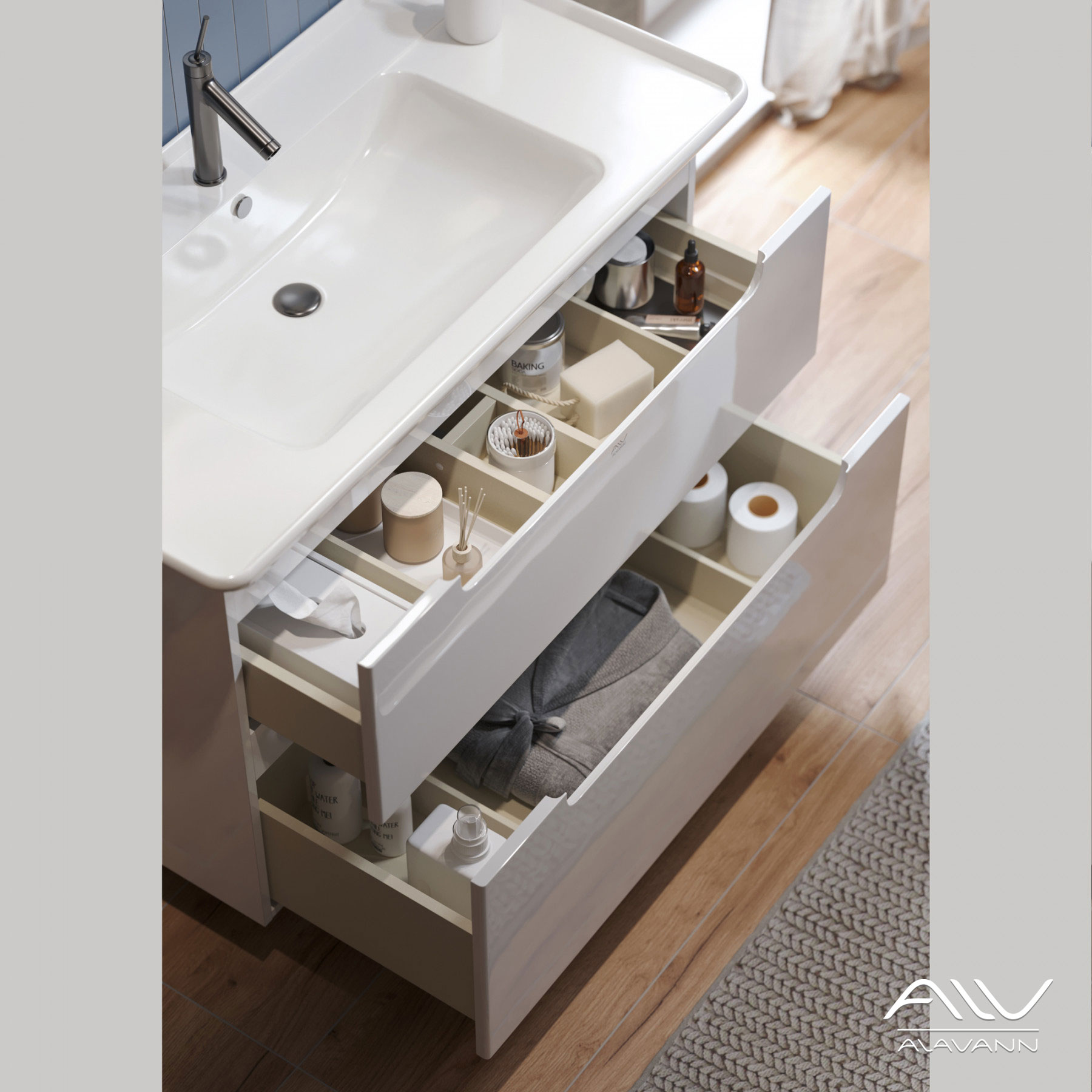 В тумбе Берта 105 имеются два вместительных выдвижных ящика на направляющих с доводчиками, которые внутри отделаны фирменным материалом – интерьерный лен и укомплектованы съемными делителями. Ящики позволят практично организовать хранение необходимых принадлежностей и бытовой химии.