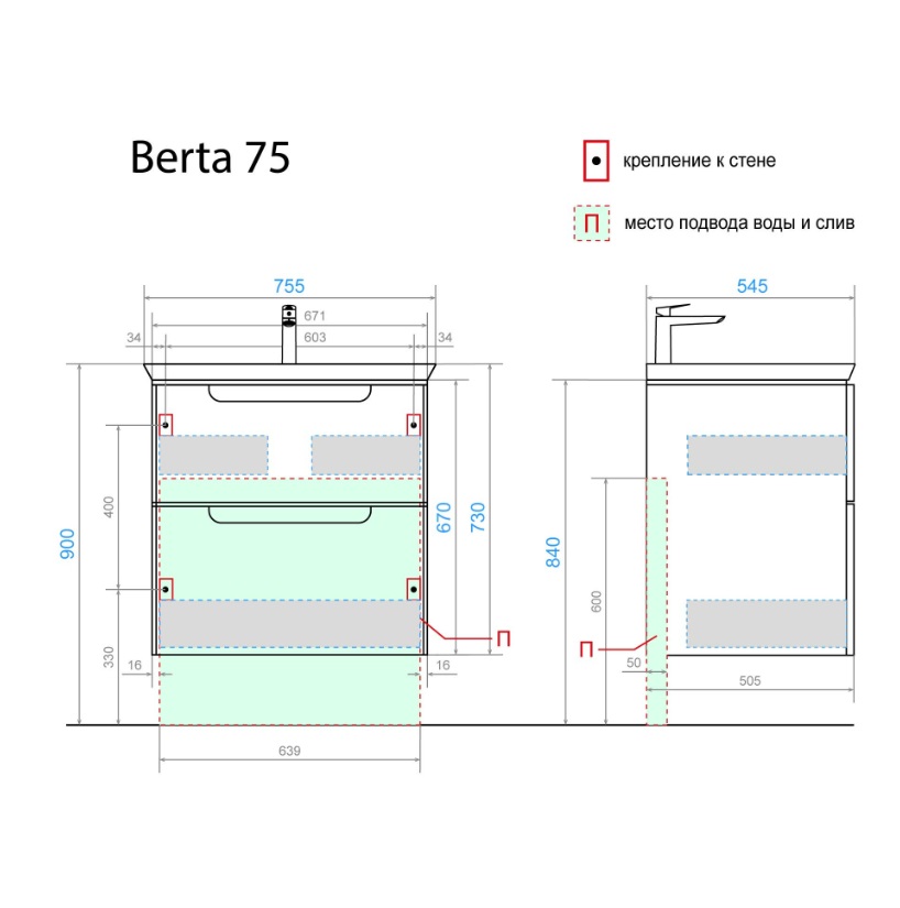 В комплектацию умывальника входит керамическая раковина Kirovit Дуглас шириной 545 мм. Бортик по периметру защищает от случайного переливания воды на пол и придает изделию завершенный облик. Благодаря лаконичному дизайну, тумба Berta («Берта») гармонично впишется в любой стиль оформления, выгодно подчеркнув эстетику окружающей обстановки.