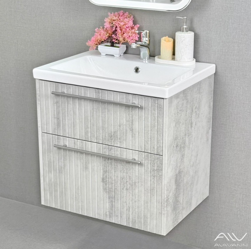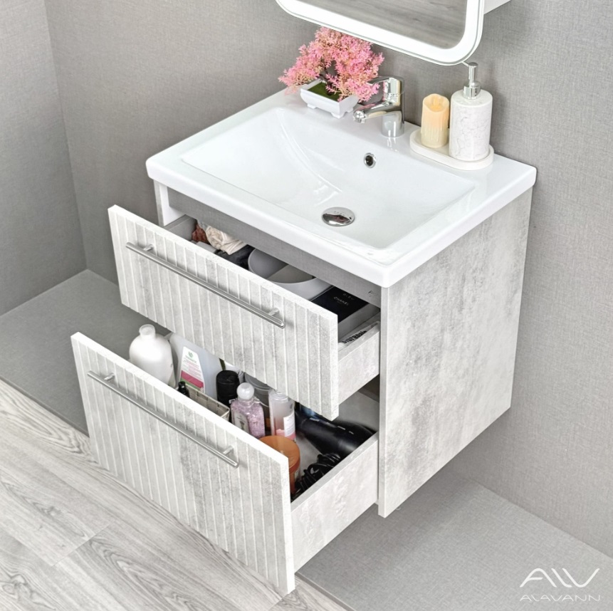 Тумба с раковиной Emma 60 серый бетон – элегантная подвесная тумба, созданная для современных ванных комнат. Корпус и фасады выполнены из высококачественного МДФ, покрытого матовой пленкой ПВХ в оттенке серого бетона. Особое внимание уделено деталям: прямая фрезеровка лицевой части добавляет изделию лаконичности, а Ручки релинг гармонично завершает общий образ.