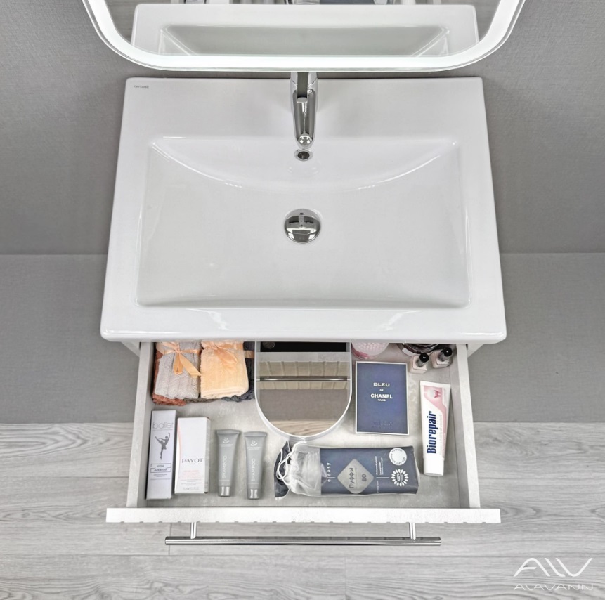 Система хранения представлена двумя выдвижными ящиками. Нижний ящик – глубокий, что удобно для хранения крупных предметов, а верхний – компактный, для мелочей и аксессуаров. Ящики изготовлены из ЛДСП с доводчиками для бесшумного закрывания. Конструкция крепится к стене с помощью надежных L-образных навесов (в комплекте – дюбели и саморезы).