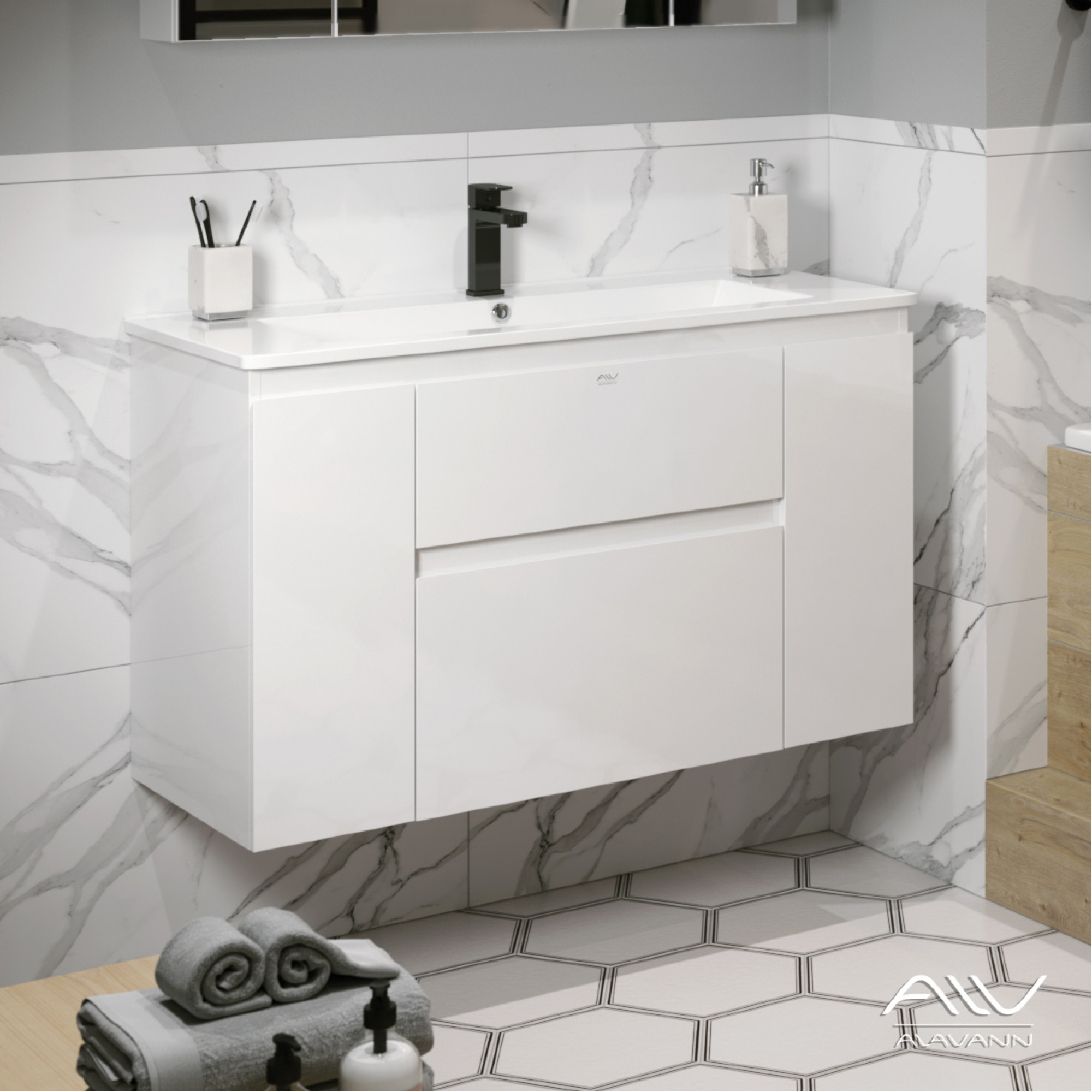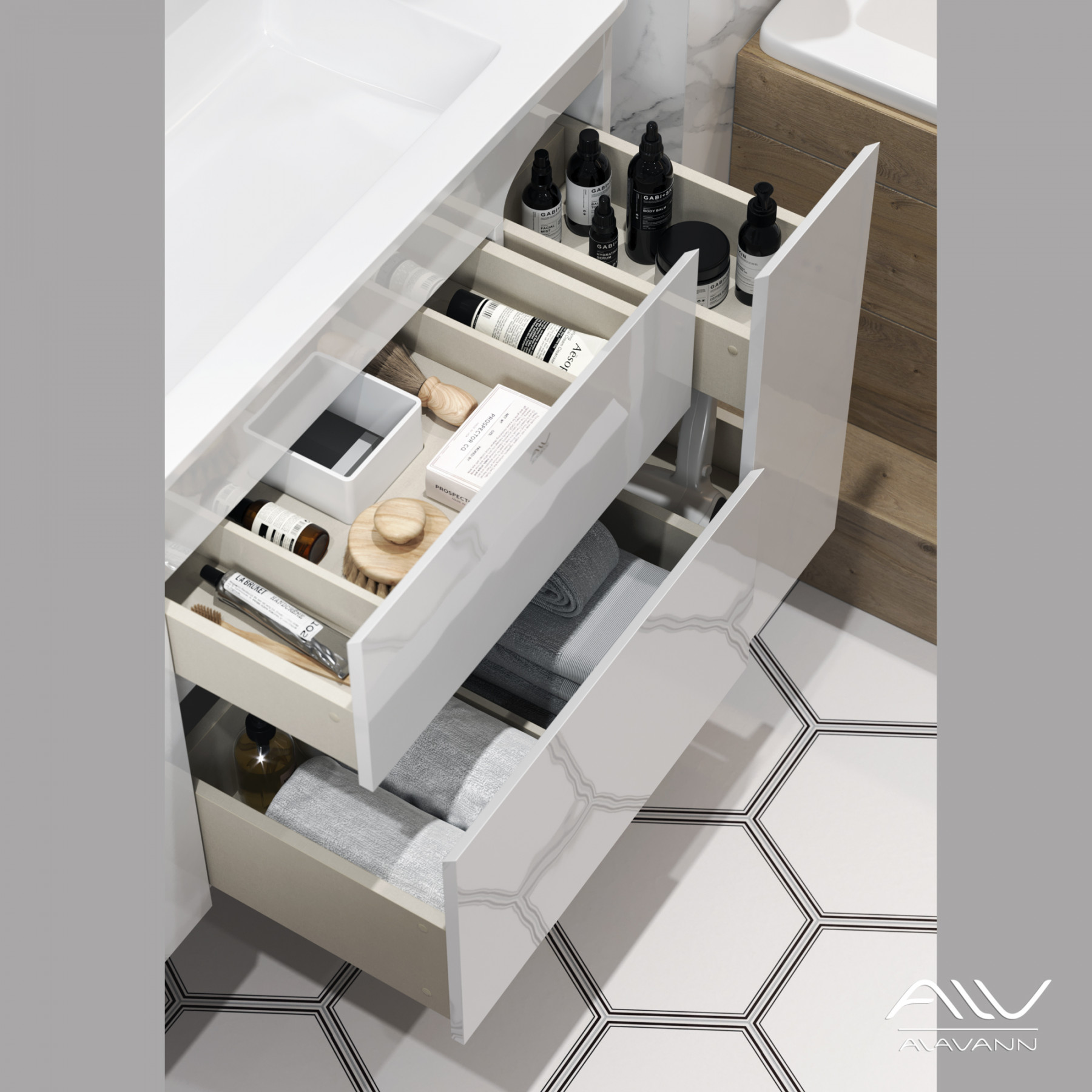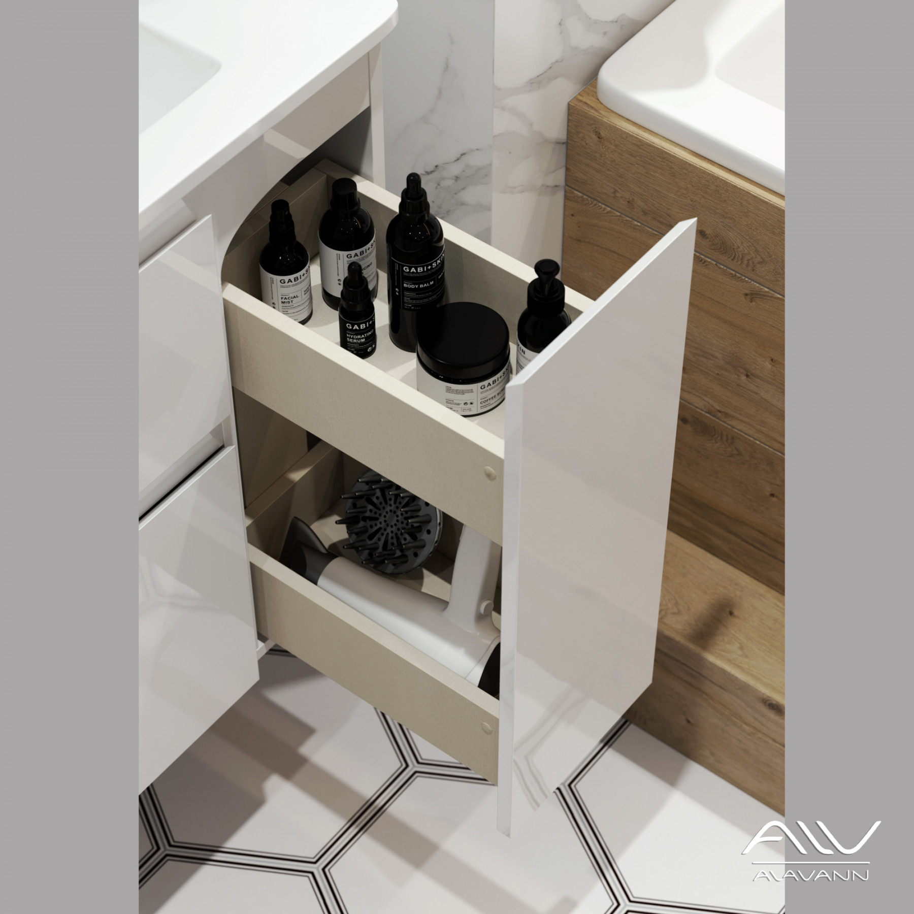 Справа бутылочница. Слева ящик с удобной полочкой для хранения полотенец. Ручки интегрированные в фасад, демонстрируют традиции европейского дизайна. Выполнены по уникальному запилу - в 45 градусов и полностью окрашены в цвет тумбы. Фасады тумбы - окрашены глянцевой эмалью. Стандартный цвет – белый, есть возможность изготовления цвета под заказ. Срок изготовления 3 недели.